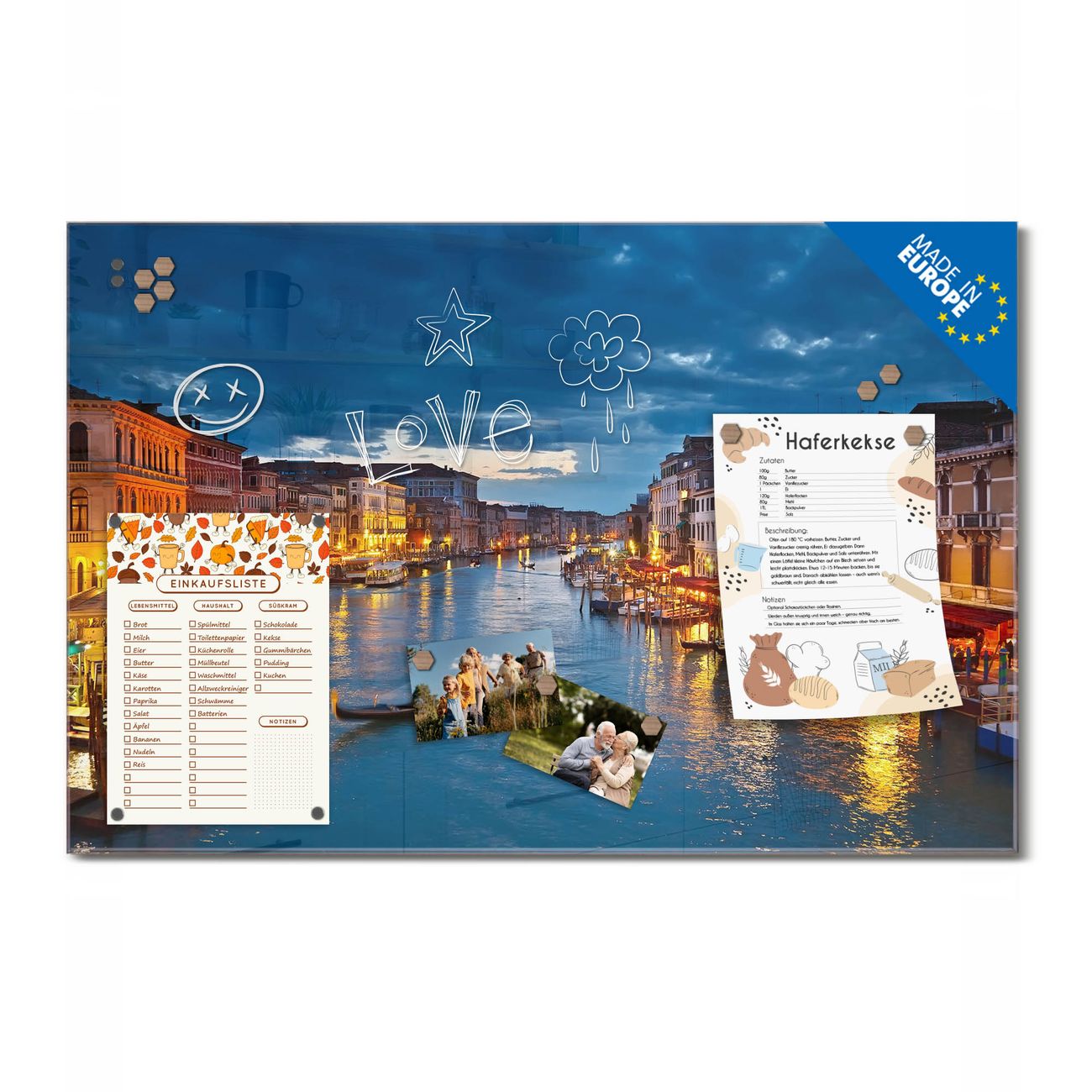 Ein Stück Design, das Ihren Alltag organisiert. Schreiben, heften, inspirieren - alles an einem Ort. Qualität, die man spürt. Montage leicht gemacht. Handwerk mit Herz - veredelt in Sachsen. Einzigartiges Design mit Motiv Motiv Canale Grande Bei Nacht Beschreibbare Glasoberfläche, leicht zu reinigen Starke Magnetkraft durch Stahlrückwand Inklusive 4 Neodym-Magneten Flexible Montageoptionen Handveredelt in Sachsen - Qualität, die bleibt