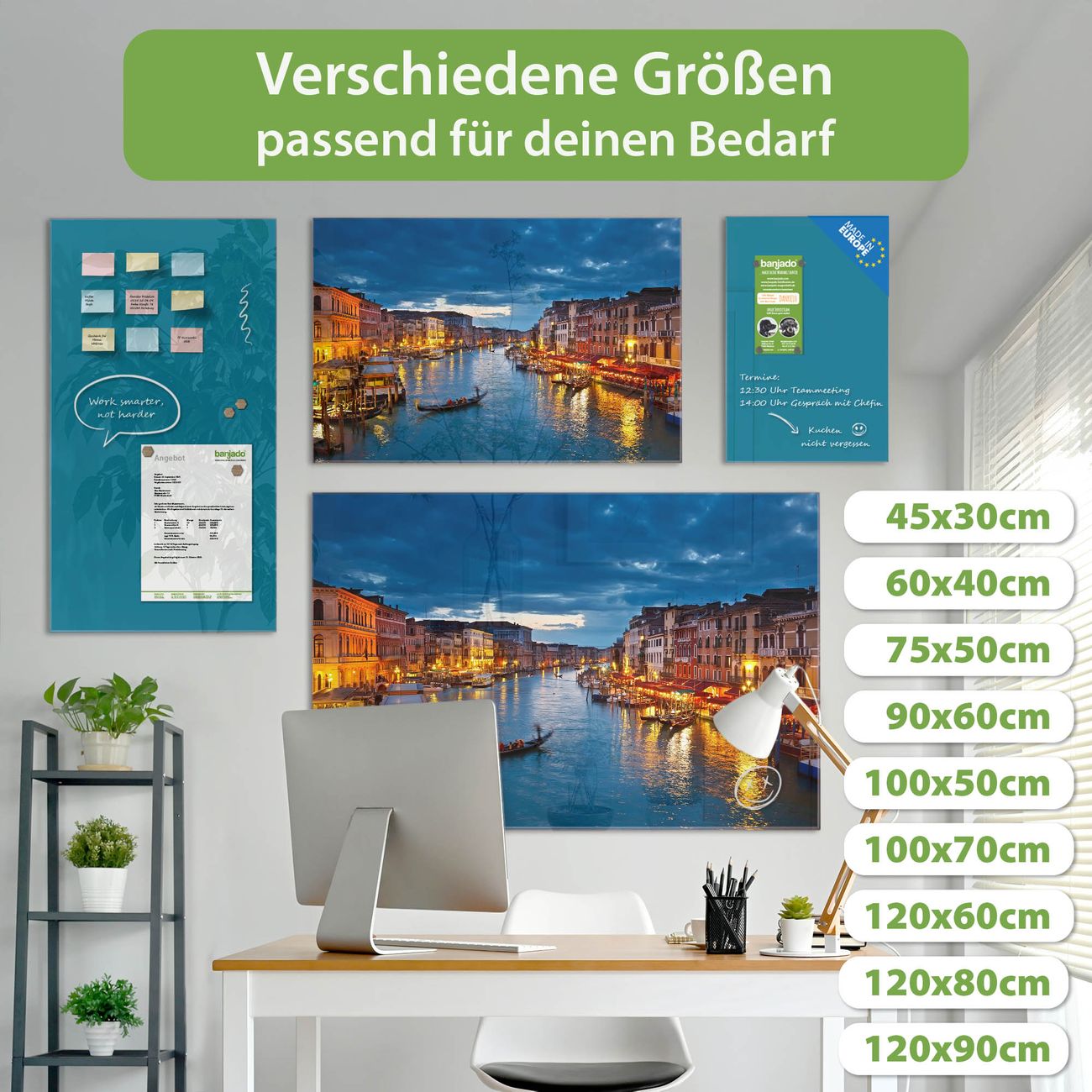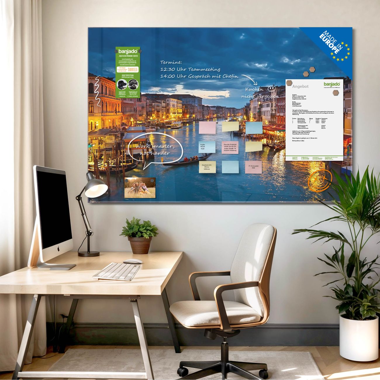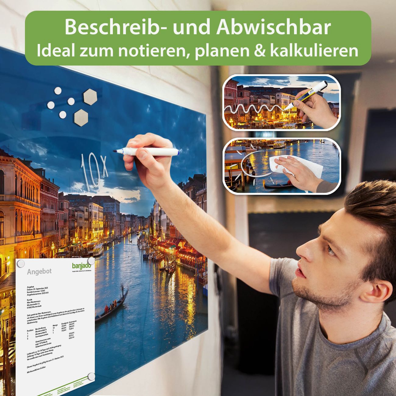 Jede Glas Magnettafel wird in unserer Werkstatt von Hand gefertigt und sorgfältig geprüft. So erhalten Sie ein echtes Qualitätsprodukt, das Funktion und Ästhetik perfekt vereint.?? Warum banjado?
