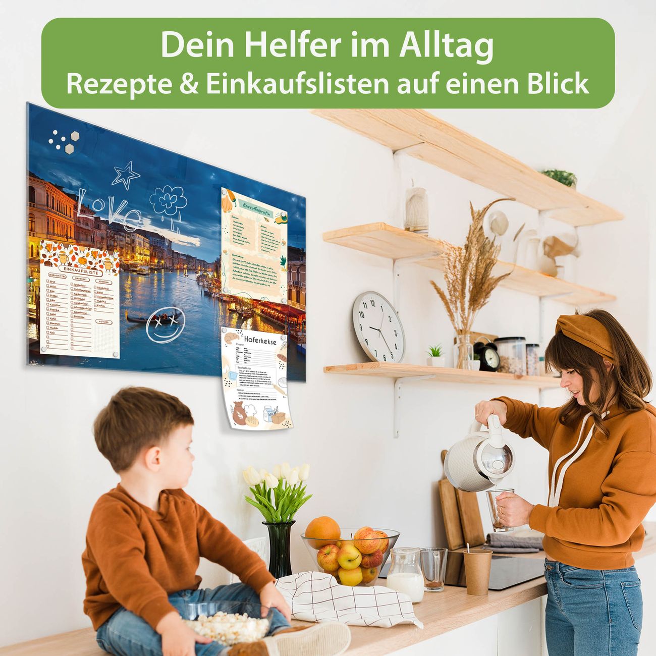 Auf der glatten Glasoberfläche lassen sich Termine, Rezepte oder Notizen ganz einfach mit Kreidestiften festhalten und rückstandslos entfernen. Starke Neodym-Magnete halten Ihre wichtigsten Erinnerungen sicher an Ort und Stelle. So entsteht Ihre ganz persönliche Ideenwand - jeden Tag neu.