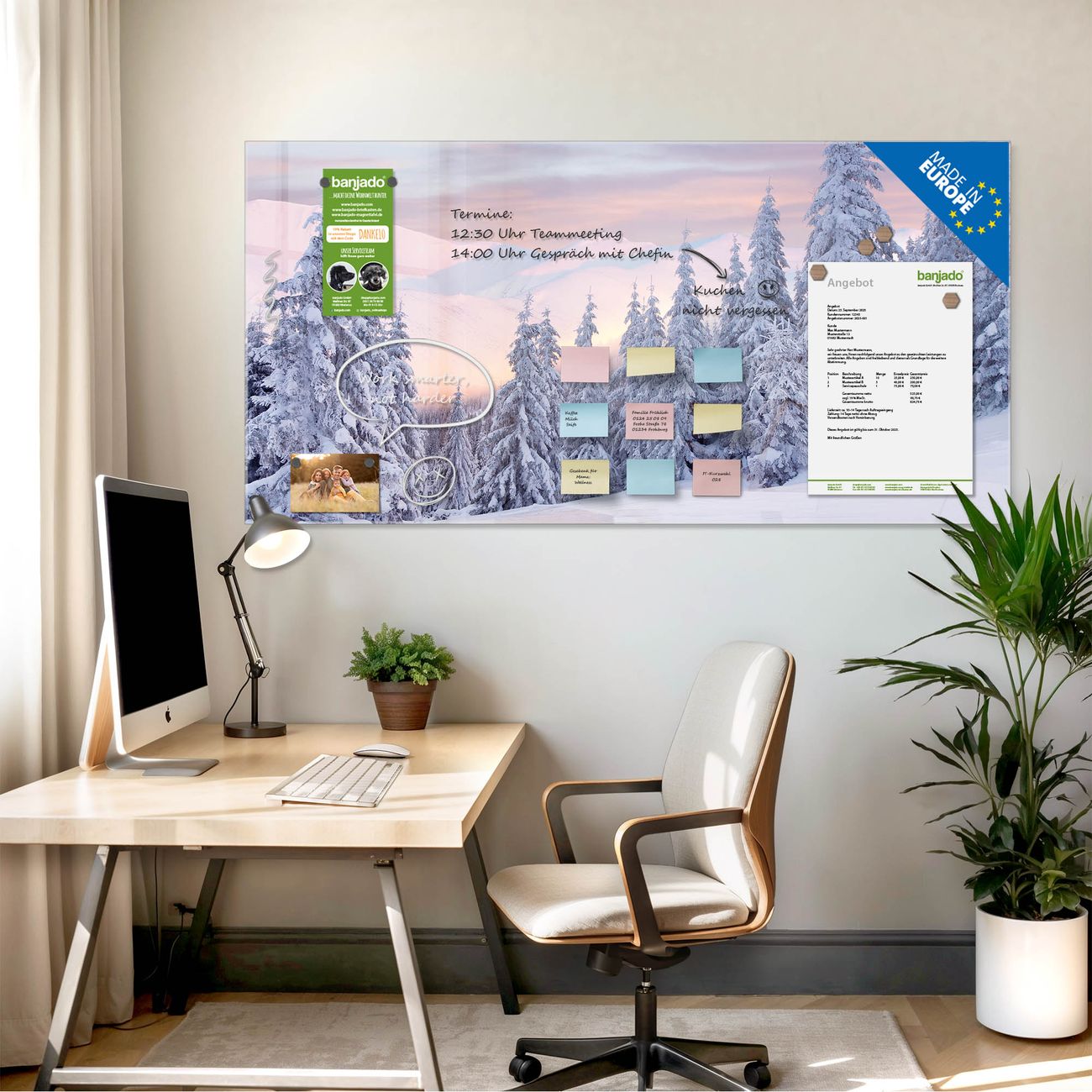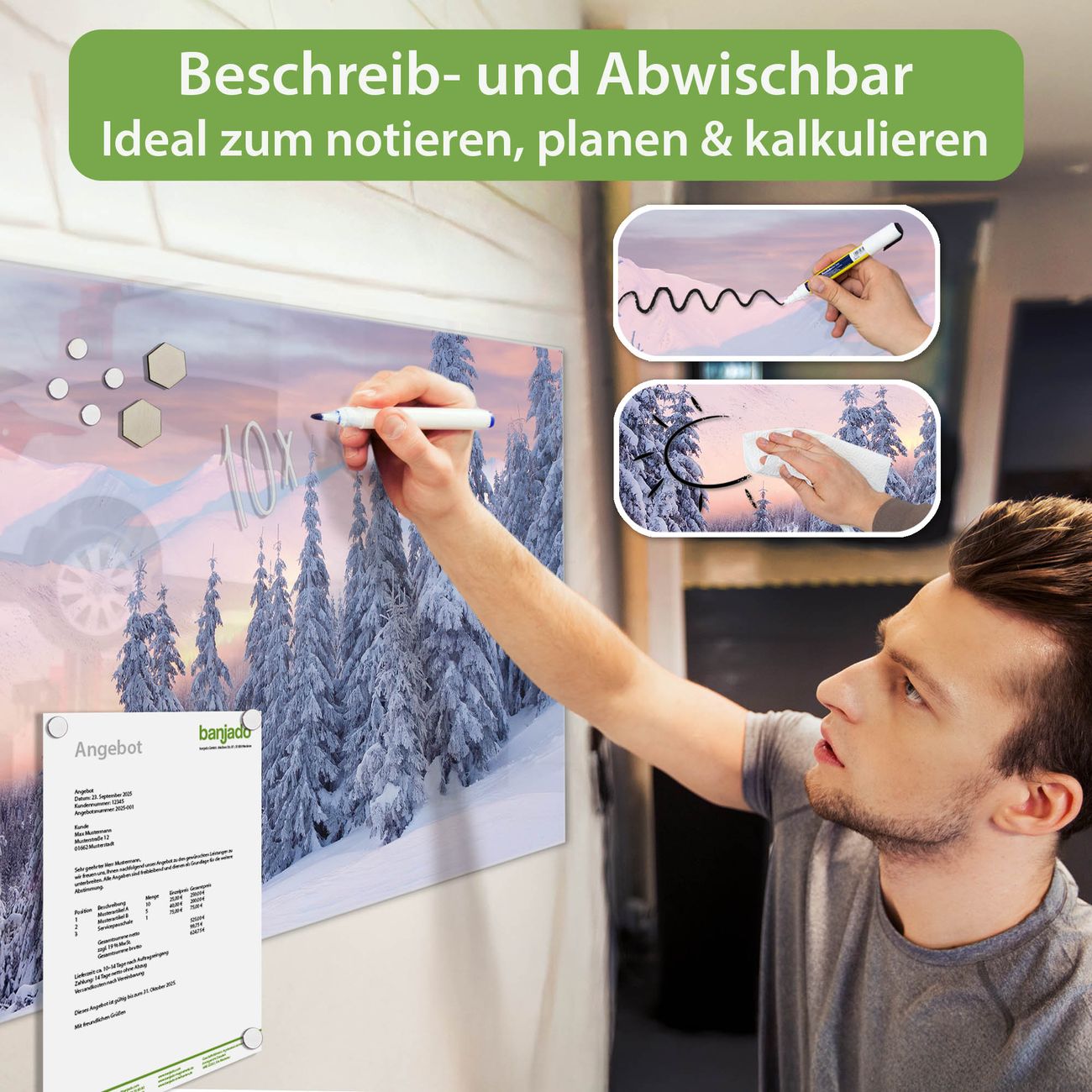 Die banjado Glas Magnettafel mit dem Motiv Motiv Verschneite Berge verbindet Funktionalität mit Stil. Sie ersetzt das Zettelchaos durch klare Strukturen und bringt dabei eine warme, natürliche Atmosphäre in Ihr Zuhause. Ob im Büro, in der Küche oder im Eingangsbereich - dieses Design-Board zieht Blicke an und sorgt für Ordnung mit Charakter.