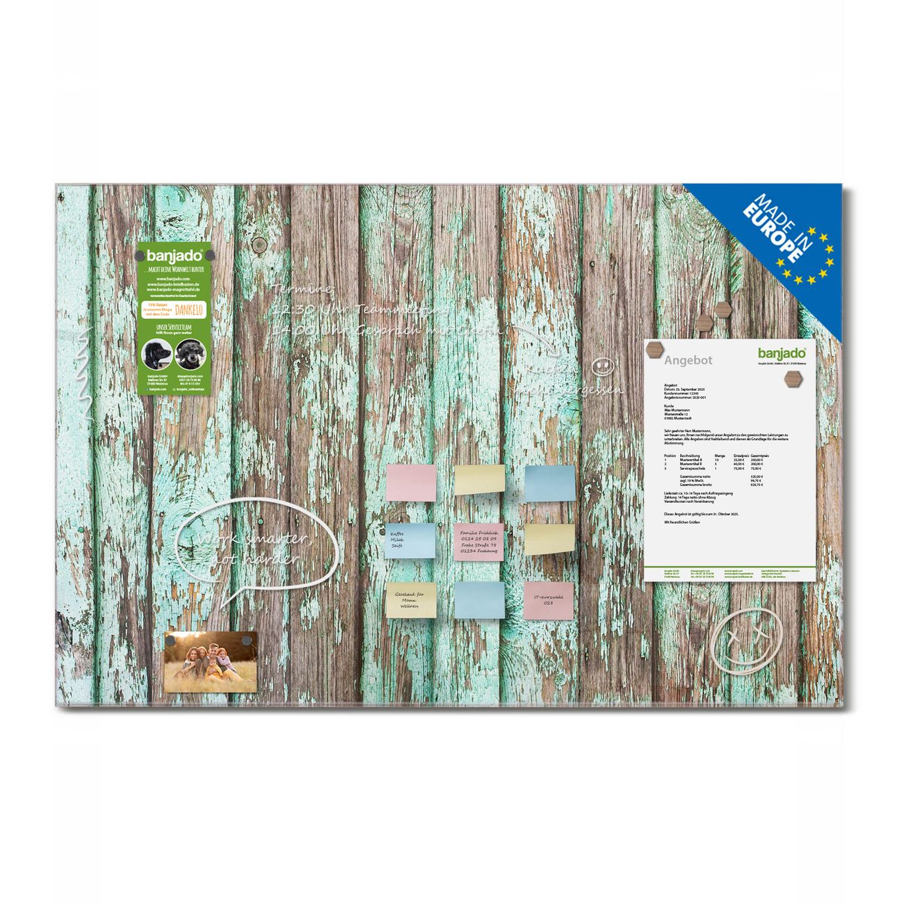 Jede Glas Magnettafel wird in unserer Werkstatt von Hand gefertigt und sorgfältig geprüft. So erhalten Sie ein echtes Qualitätsprodukt, das Funktion und Ästhetik perfekt vereint.?? Warum banjado?