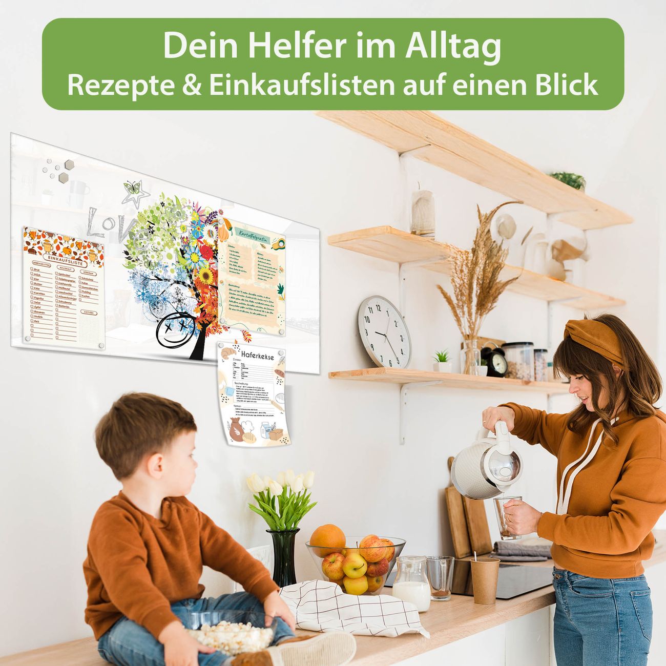 Auf der glatten Glasoberfläche lassen sich Termine, Rezepte oder Notizen ganz einfach mit Kreidestiften festhalten und rückstandslos entfernen. Starke Neodym-Magnete halten Ihre wichtigsten Erinnerungen sicher an Ort und Stelle. So entsteht Ihre ganz persönliche Ideenwand - jeden Tag neu.