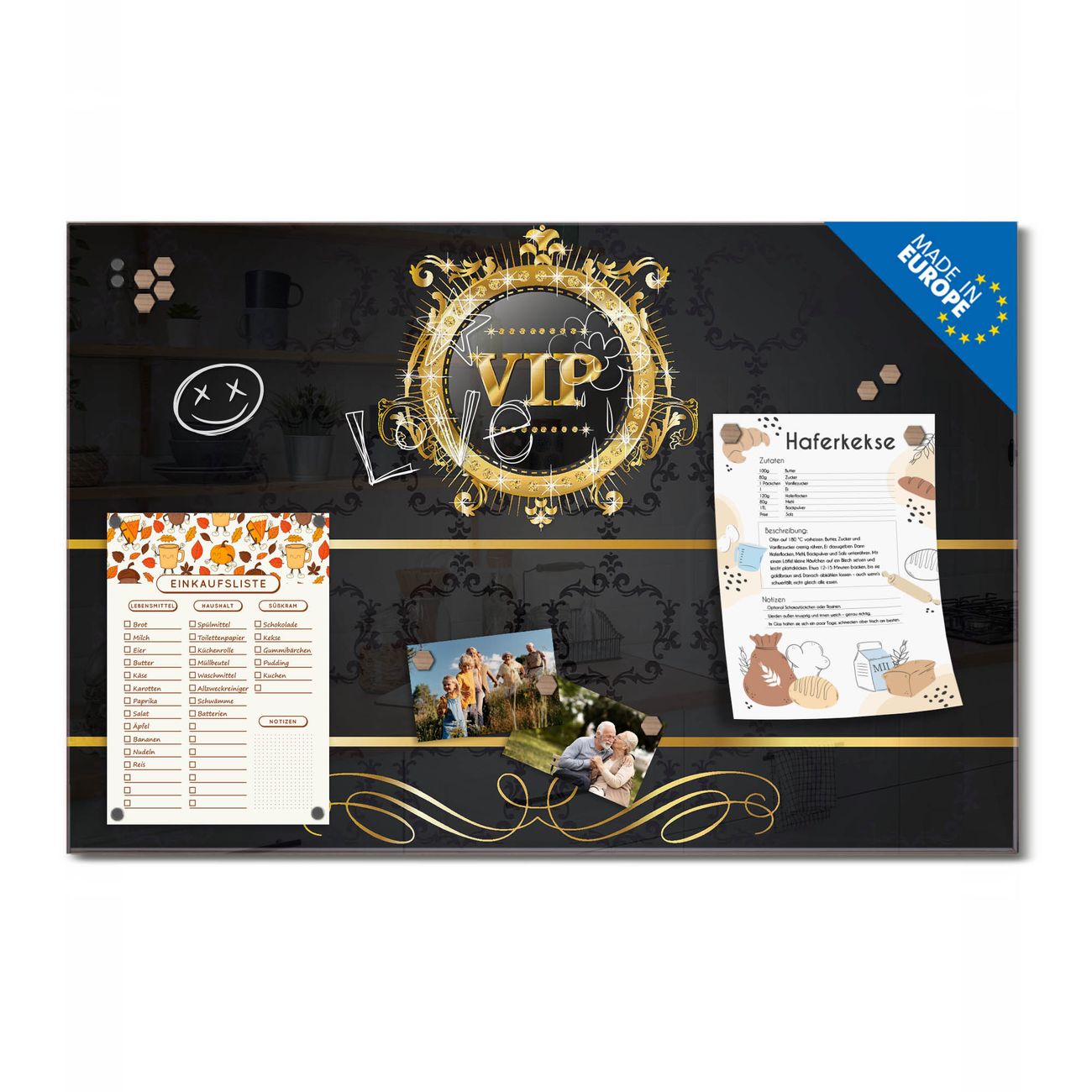 Ein Stück Design, das Ihren Alltag organisiert. Schreiben, heften, inspirieren - alles an einem Ort. Qualität, die man spürt. Montage leicht gemacht. Handwerk mit Herz - veredelt in Sachsen. Einzigartiges Design mit Motiv Motiv VIP Beschreibbare Glasoberfläche, leicht zu reinigen Starke Magnetkraft durch Stahlrückwand Inklusive 4 Neodym-Magneten Flexible Montageoptionen Handveredelt in Sachsen - Qualität, die bleibt