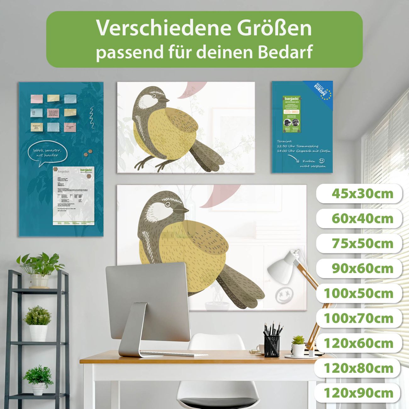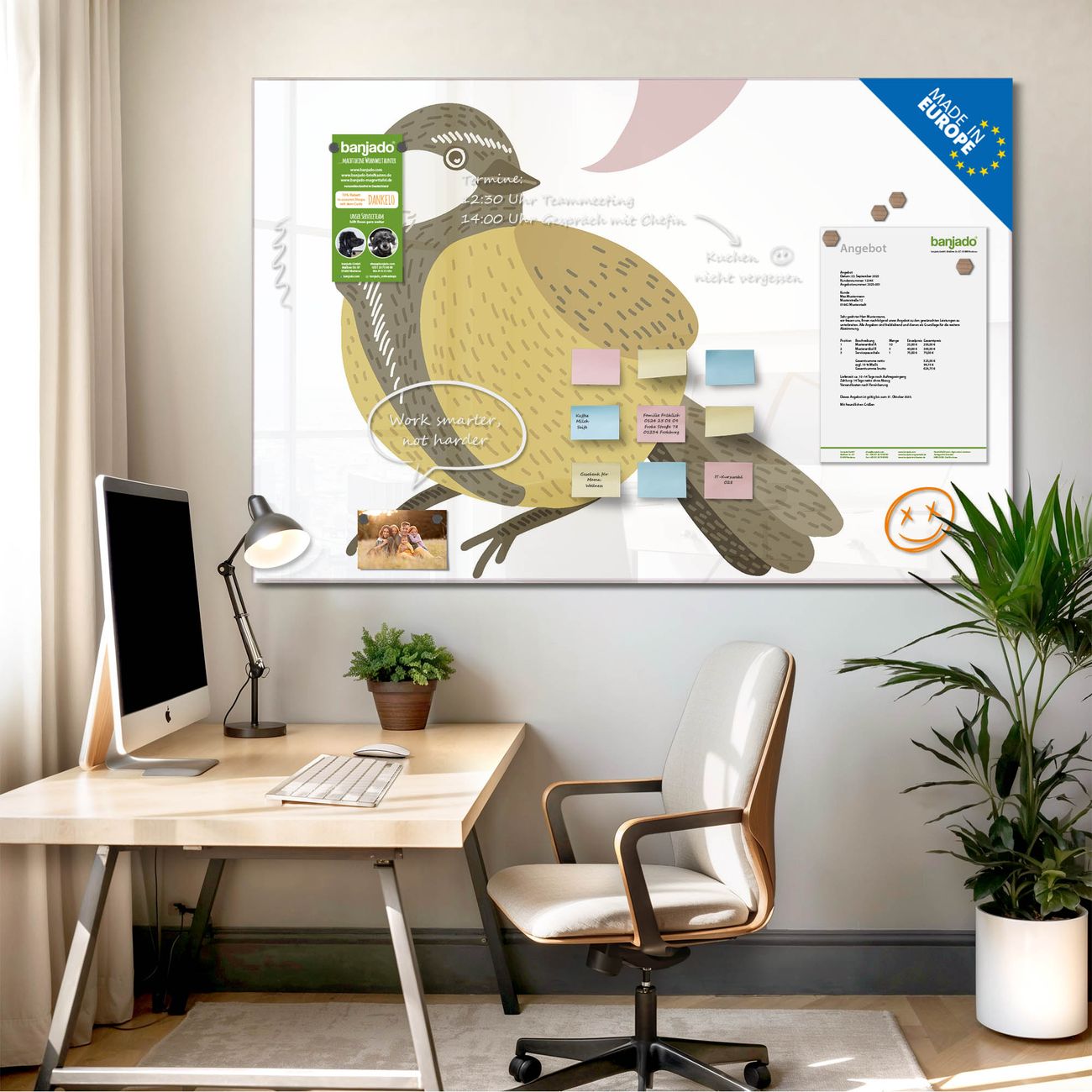 Die banjado Glas Magnettafel mit dem Motiv Motiv Vogel mit Sprechblase verbindet Funktionalität mit Stil. Sie ersetzt das Zettelchaos durch klare Strukturen und bringt dabei eine warme, natürliche Atmosphäre in Ihr Zuhause. Ob im Büro, in der Küche oder im Eingangsbereich - dieses Design-Board zieht Blicke an und sorgt für Ordnung mit Charakter.
