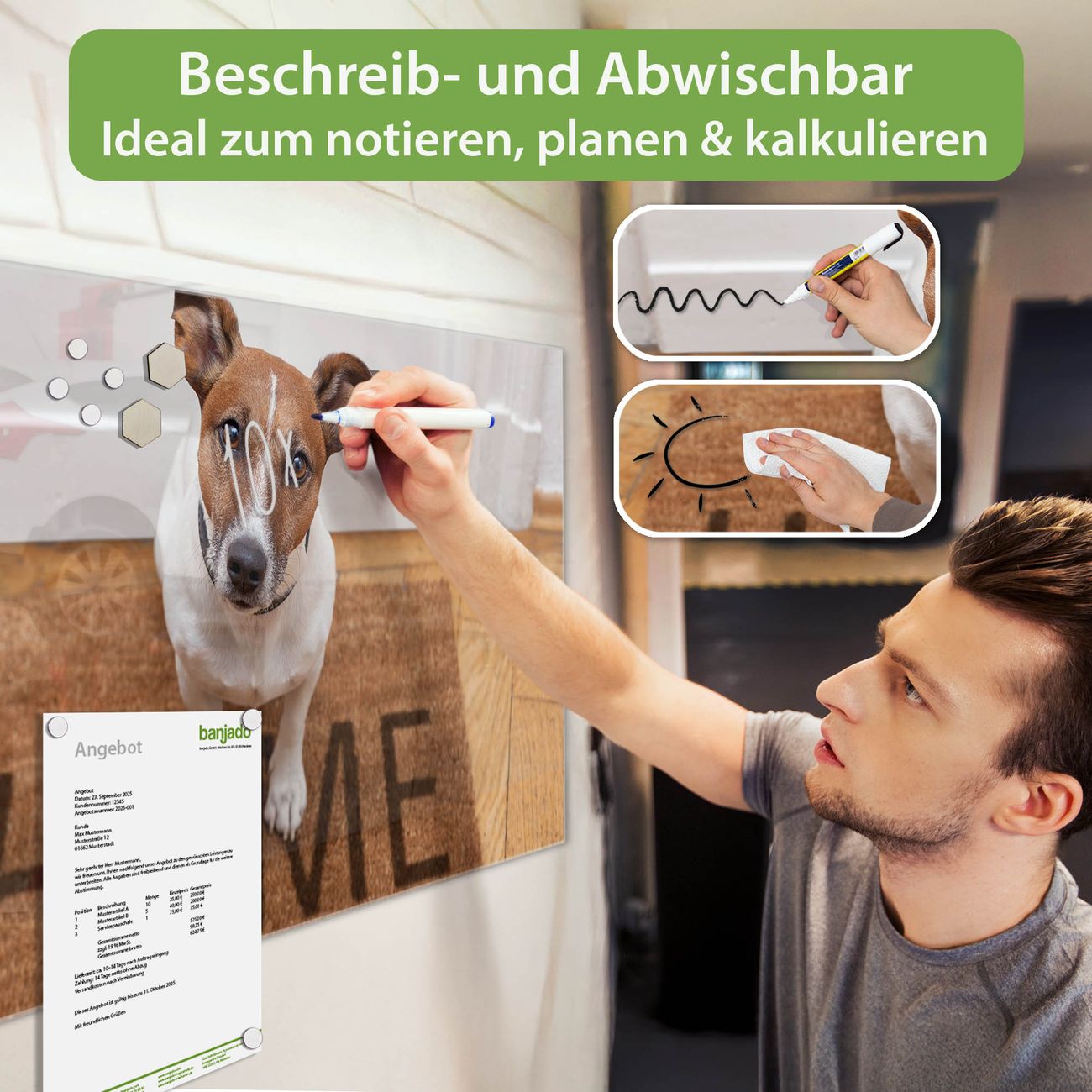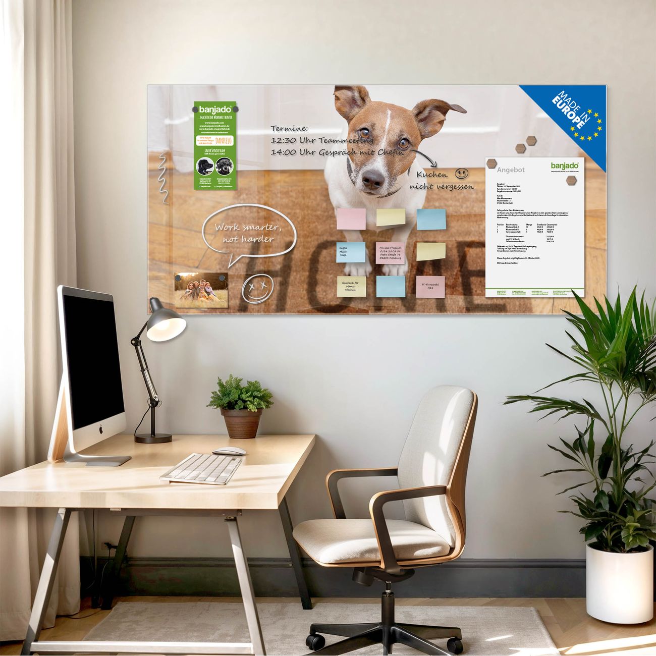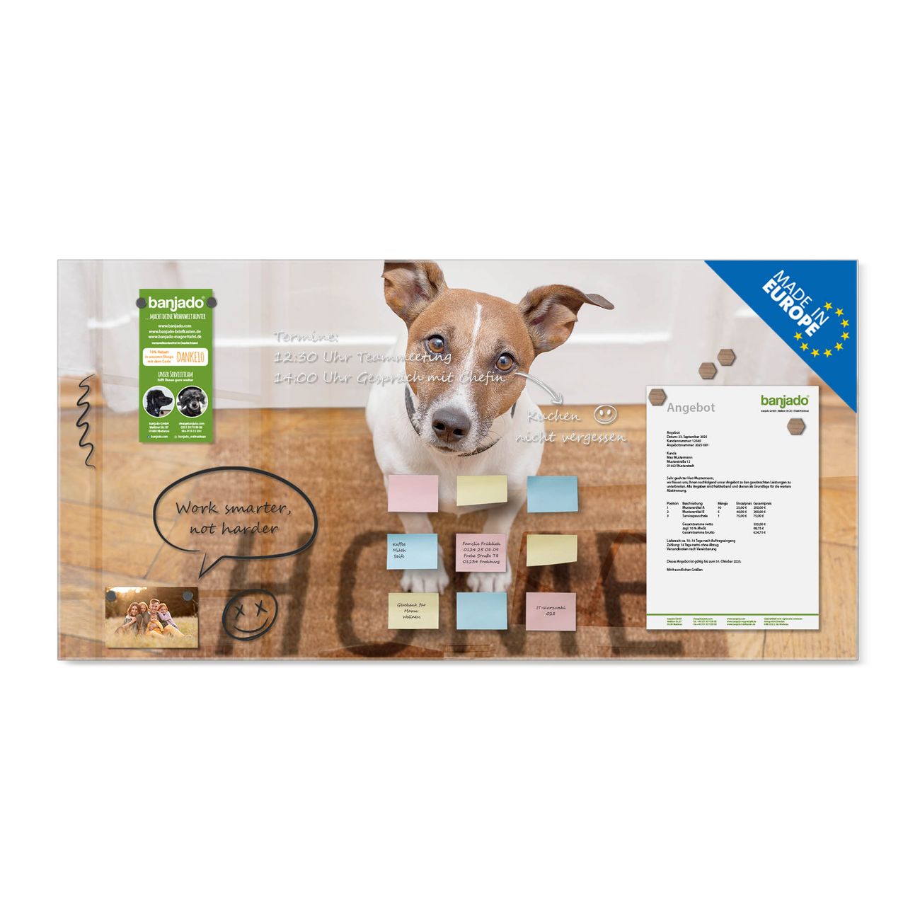 Die banjado Glas Magnettafel mit dem Motiv Motiv Wachhund Jack Russel verbindet Funktionalität mit Stil. Sie ersetzt das Zettelchaos durch klare Strukturen und bringt dabei eine warme, natürliche Atmosphäre in Ihr Zuhause. Ob im Büro, in der Küche oder im Eingangsbereich - dieses Design-Board zieht Blicke an und sorgt für Ordnung mit Charakter.