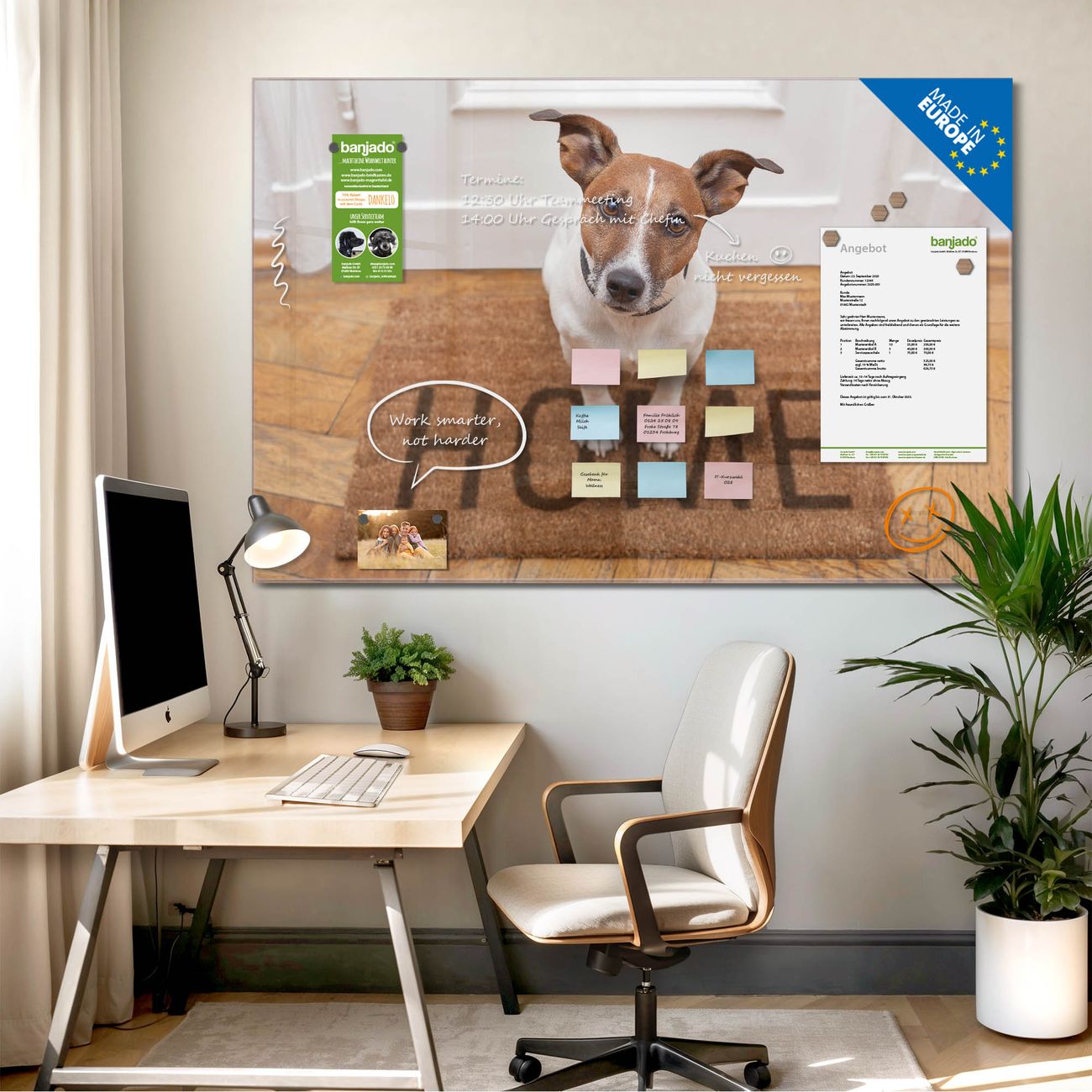 Jede Glas Magnettafel wird in unserer Werkstatt von Hand gefertigt und sorgfältig geprüft. So erhalten Sie ein echtes Qualitätsprodukt, das Funktion und Ästhetik perfekt vereint.?? Warum banjado?