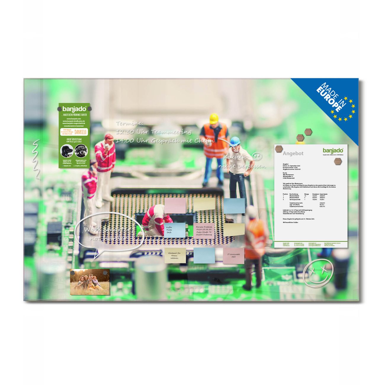 Jede Glas Magnettafel wird in unserer Werkstatt von Hand gefertigt und sorgfältig geprüft. So erhalten Sie ein echtes Qualitätsprodukt, das Funktion und Ästhetik perfekt vereint.?? Warum banjado?