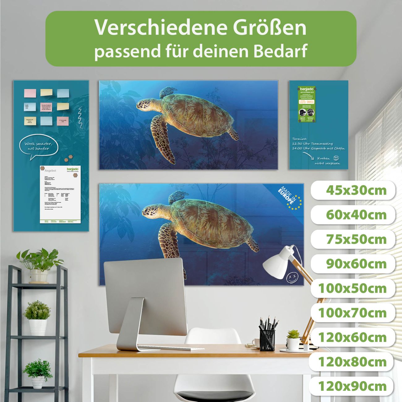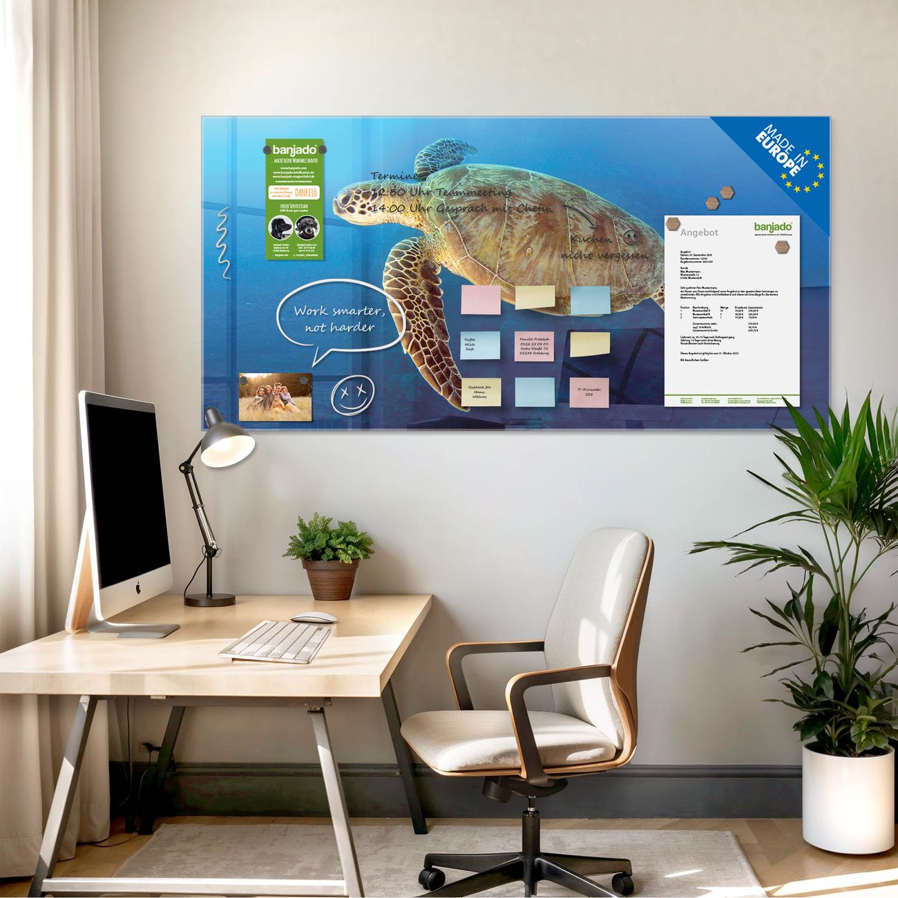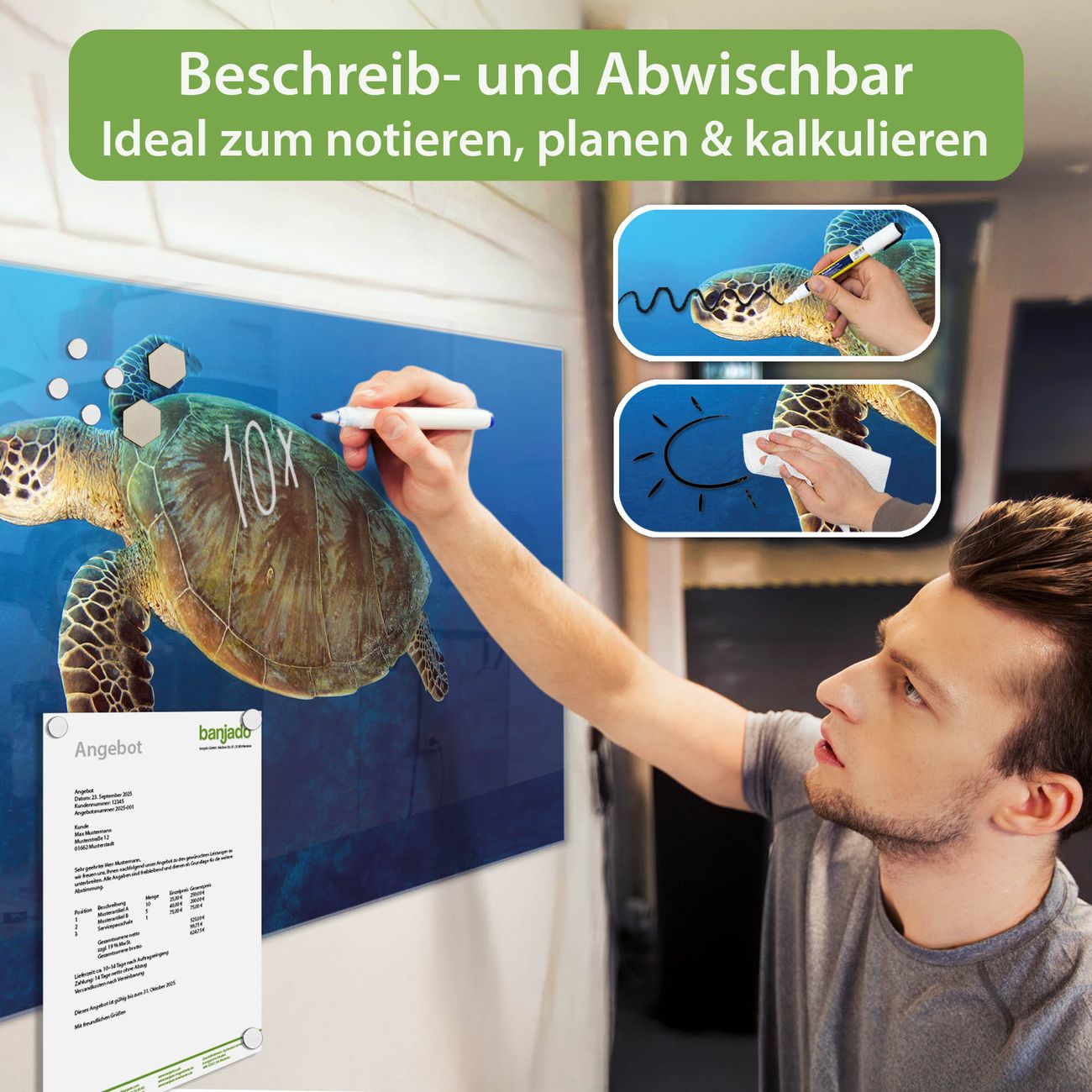 Jede Glas Magnettafel wird in unserer Werkstatt von Hand gefertigt und sorgfältig geprüft. So erhalten Sie ein echtes Qualitätsprodukt, das Funktion und Ästhetik perfekt vereint.?? Warum banjado?