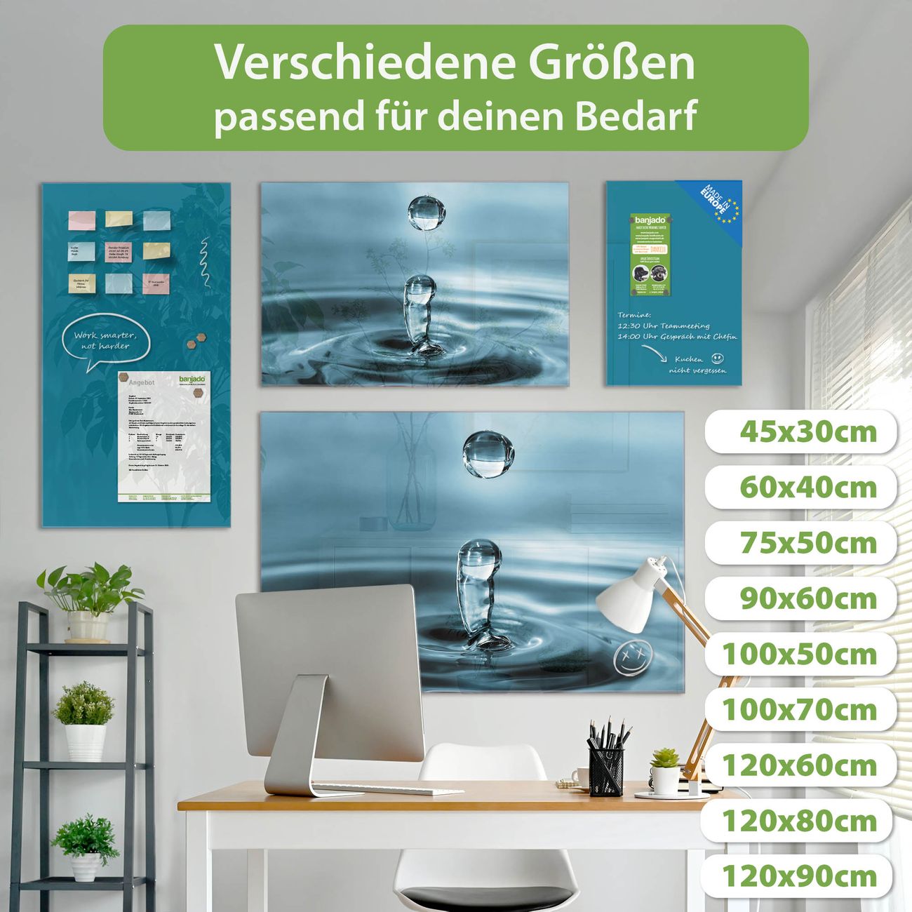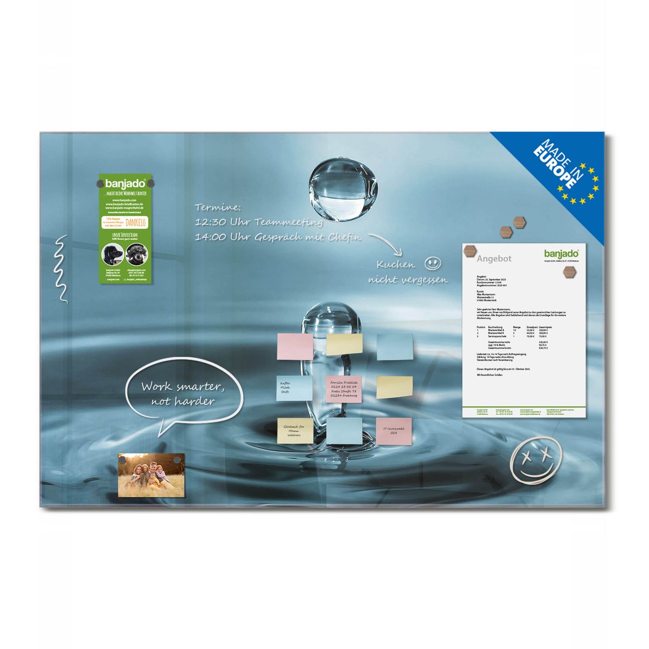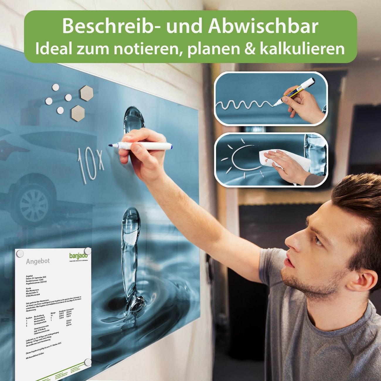 Jede Glas Magnettafel wird in unserer Werkstatt von Hand gefertigt und sorgfältig geprüft. So erhalten Sie ein echtes Qualitätsprodukt, das Funktion und Ästhetik perfekt vereint.?? Warum banjado?