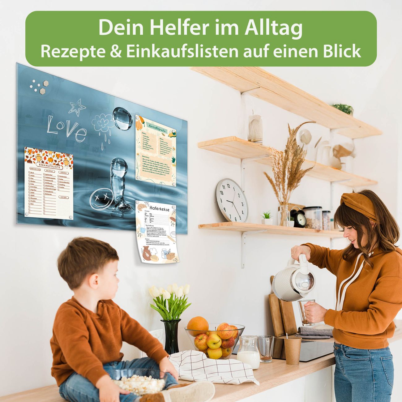 Auf der glatten Glasoberfläche lassen sich Termine, Rezepte oder Notizen ganz einfach mit Kreidestiften festhalten und rückstandslos entfernen. Starke Neodym-Magnete halten Ihre wichtigsten Erinnerungen sicher an Ort und Stelle. So entsteht Ihre ganz persönliche Ideenwand - jeden Tag neu.