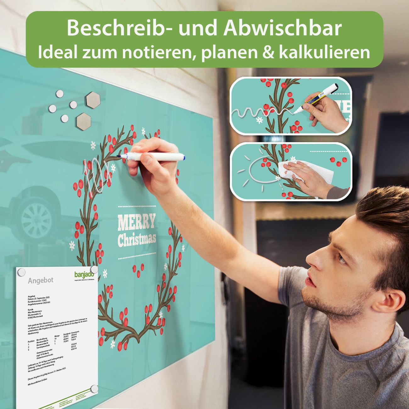 Jede Glas Magnettafel wird in unserer Werkstatt von Hand gefertigt und sorgfältig geprüft. So erhalten Sie ein echtes Qualitätsprodukt, das Funktion und Ästhetik perfekt vereint.?? Warum banjado?