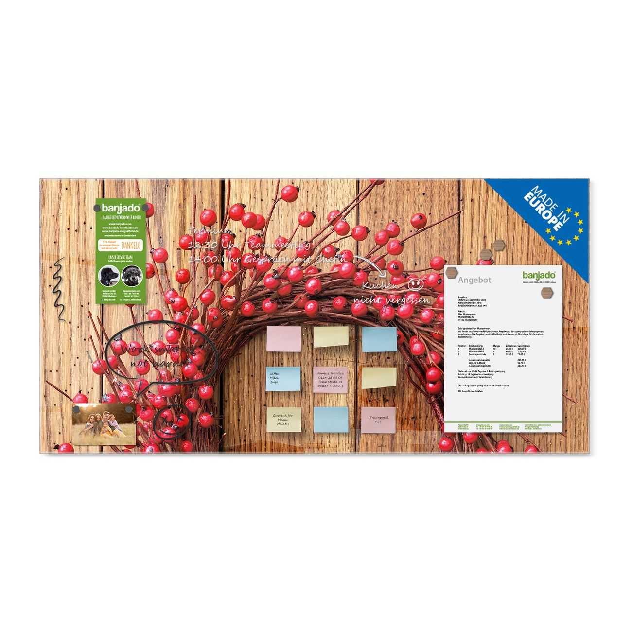 Ein Stück Design, das Ihren Alltag organisiert. Schreiben, heften, inspirieren - alles an einem Ort. Qualität, die man spürt. Montage leicht gemacht. Handwerk mit Herz - veredelt in Sachsen. Einzigartiges Design mit Motiv Motiv Weihnachtskranz Beschreibbare Glasoberfläche, leicht zu reinigen Starke Magnetkraft durch Stahlrückwand Inklusive 4 Neodym-Magneten Flexible Montageoptionen Handveredelt in Sachsen - Qualität, die bleibt