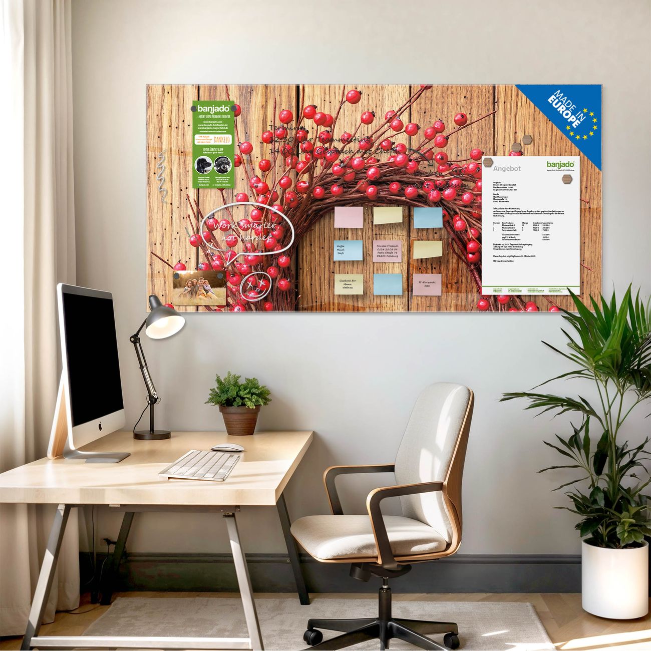 Jede Glas Magnettafel wird in unserer Werkstatt von Hand gefertigt und sorgfältig geprüft. So erhalten Sie ein echtes Qualitätsprodukt, das Funktion und Ästhetik perfekt vereint.?? Warum banjado?