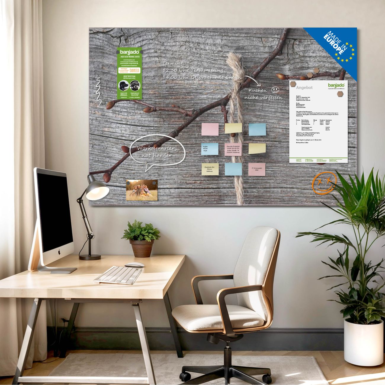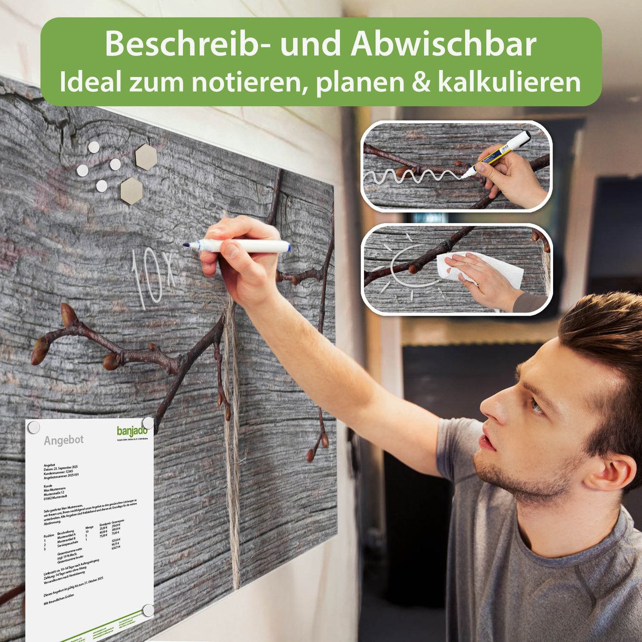 Jede Glas Magnettafel wird in unserer Werkstatt von Hand gefertigt und sorgfältig geprüft. So erhalten Sie ein echtes Qualitätsprodukt, das Funktion und Ästhetik perfekt vereint.?? Warum banjado?