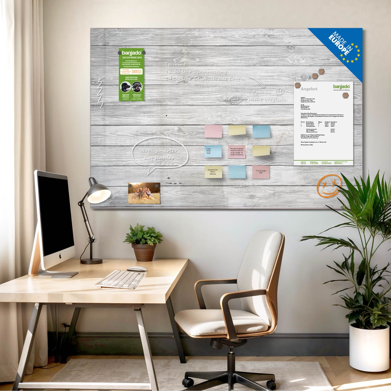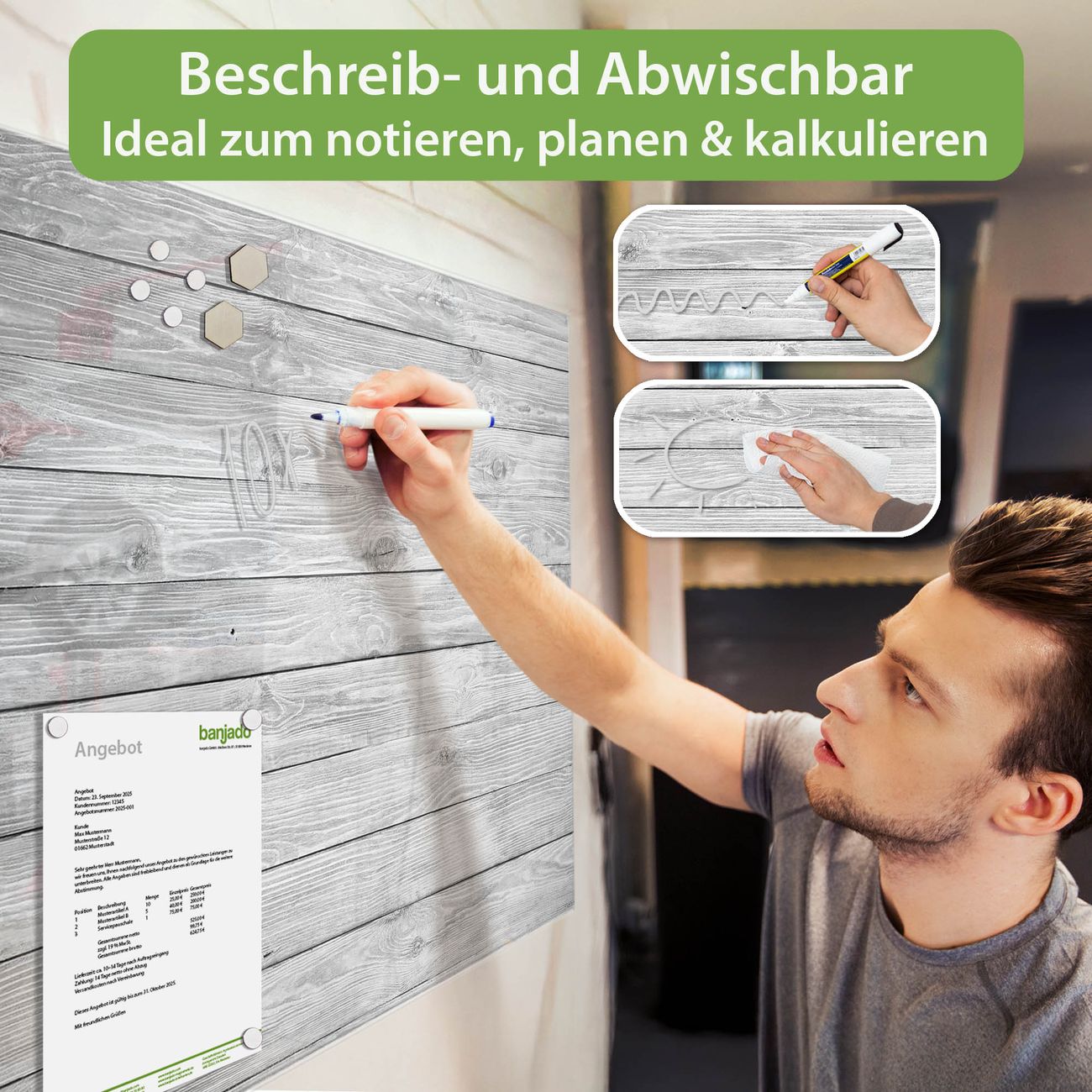 Jede Glas Magnettafel wird in unserer Werkstatt von Hand gefertigt und sorgfältig geprüft. So erhalten Sie ein echtes Qualitätsprodukt, das Funktion und Ästhetik perfekt vereint.?? Warum banjado?