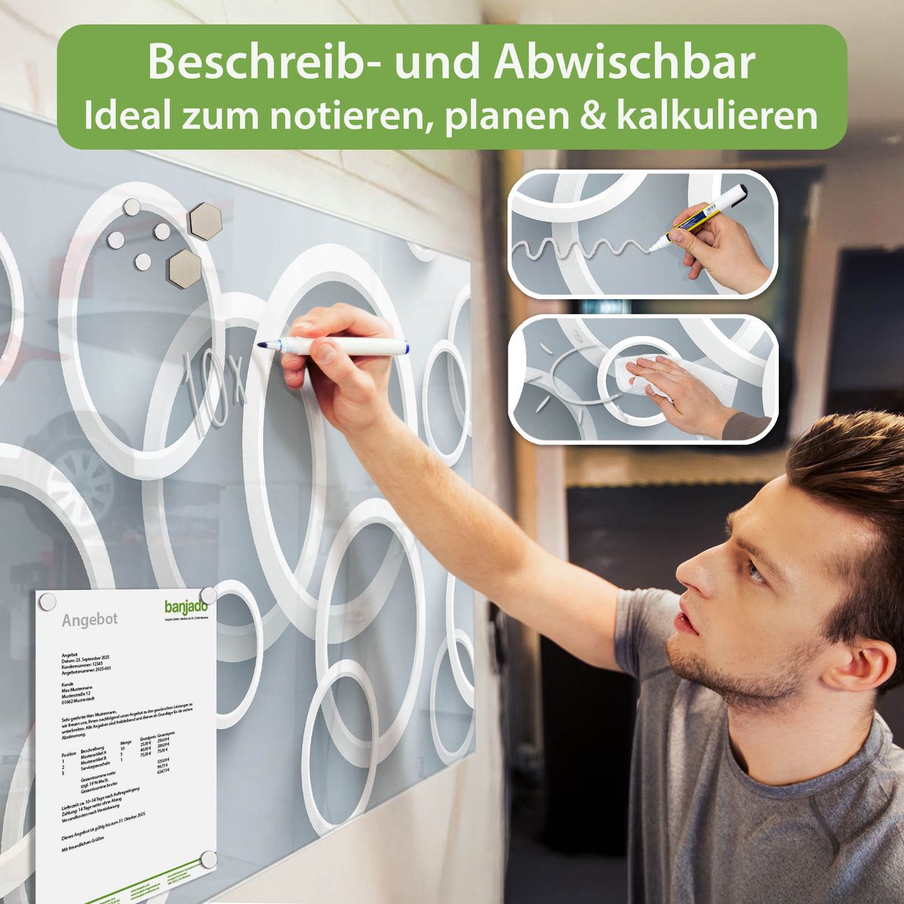 Die banjado Glas Magnettafel mit dem Motiv Motiv Weiße Ringe verbindet Funktionalität mit Stil. Sie ersetzt das Zettelchaos durch klare Strukturen und bringt dabei eine warme, natürliche Atmosphäre in Ihr Zuhause. Ob im Büro, in der Küche oder im Eingangsbereich - dieses Design-Board zieht Blicke an und sorgt für Ordnung mit Charakter.