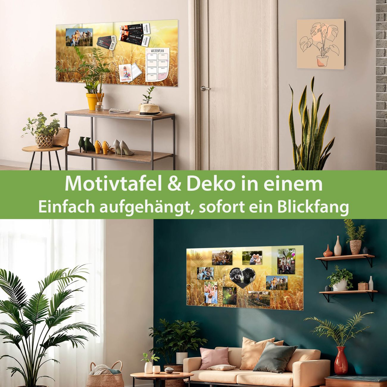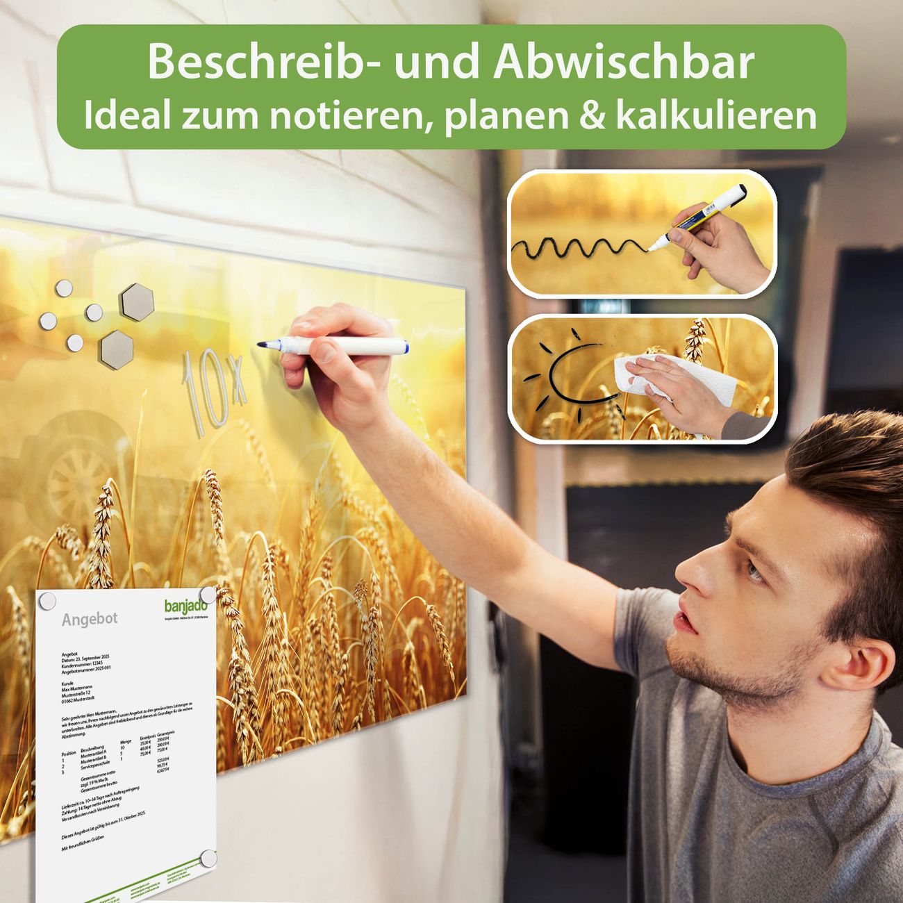 Die banjado Glas Magnettafel mit dem Motiv Motiv Weizenfeld verbindet Funktionalität mit Stil. Sie ersetzt das Zettelchaos durch klare Strukturen und bringt dabei eine warme, natürliche Atmosphäre in Ihr Zuhause. Ob im Büro, in der Küche oder im Eingangsbereich - dieses Design-Board zieht Blicke an und sorgt für Ordnung mit Charakter.