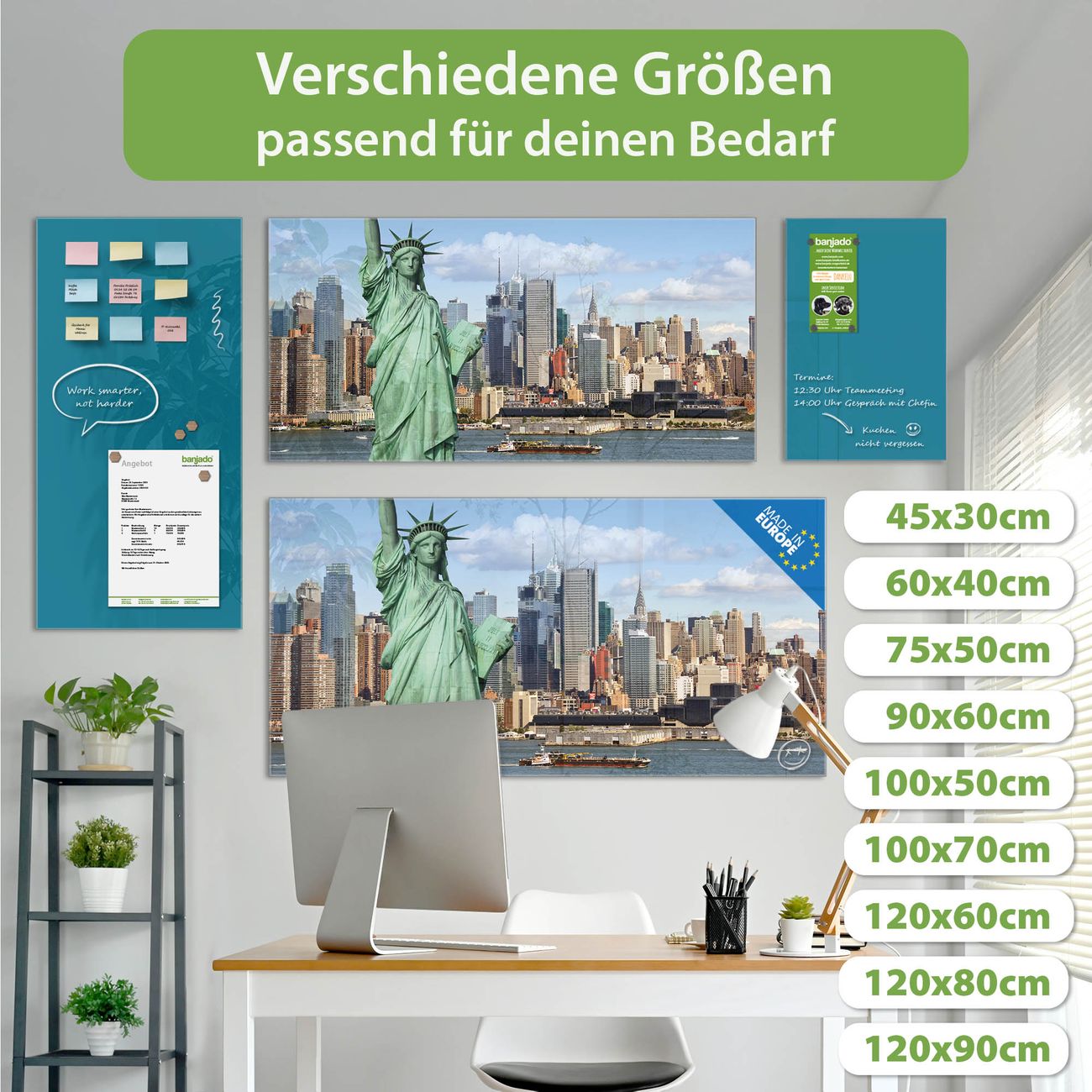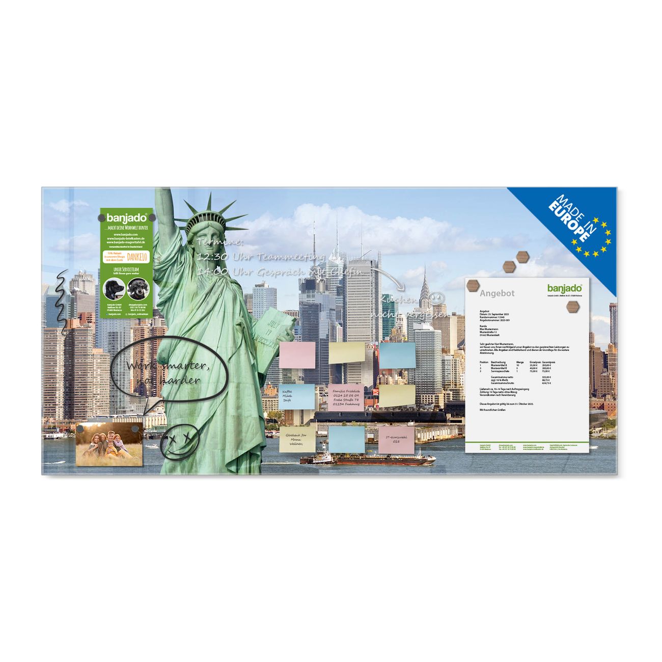 Jede Glas Magnettafel wird in unserer Werkstatt von Hand gefertigt und sorgfältig geprüft. So erhalten Sie ein echtes Qualitätsprodukt, das Funktion und Ästhetik perfekt vereint.?? Warum banjado?