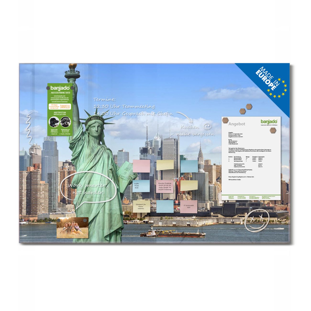 Jede Glas Magnettafel wird in unserer Werkstatt von Hand gefertigt und sorgfältig geprüft. So erhalten Sie ein echtes Qualitätsprodukt, das Funktion und Ästhetik perfekt vereint.?? Warum banjado?