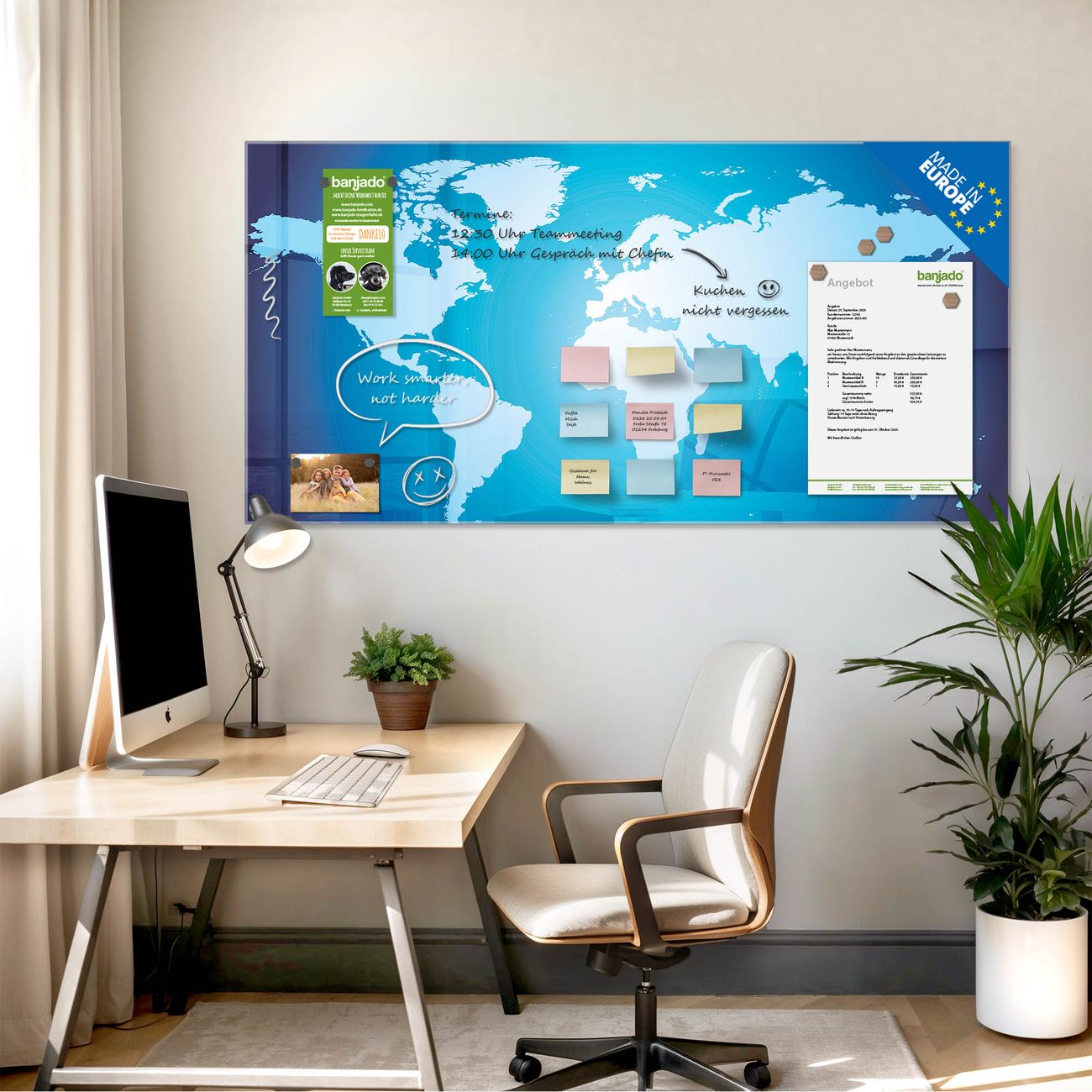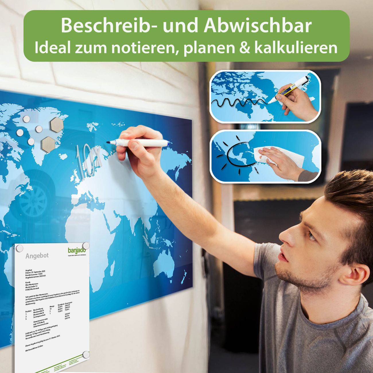 Jede Glas Magnettafel wird in unserer Werkstatt von Hand gefertigt und sorgfältig geprüft. So erhalten Sie ein echtes Qualitätsprodukt, das Funktion und Ästhetik perfekt vereint.?? Warum banjado?