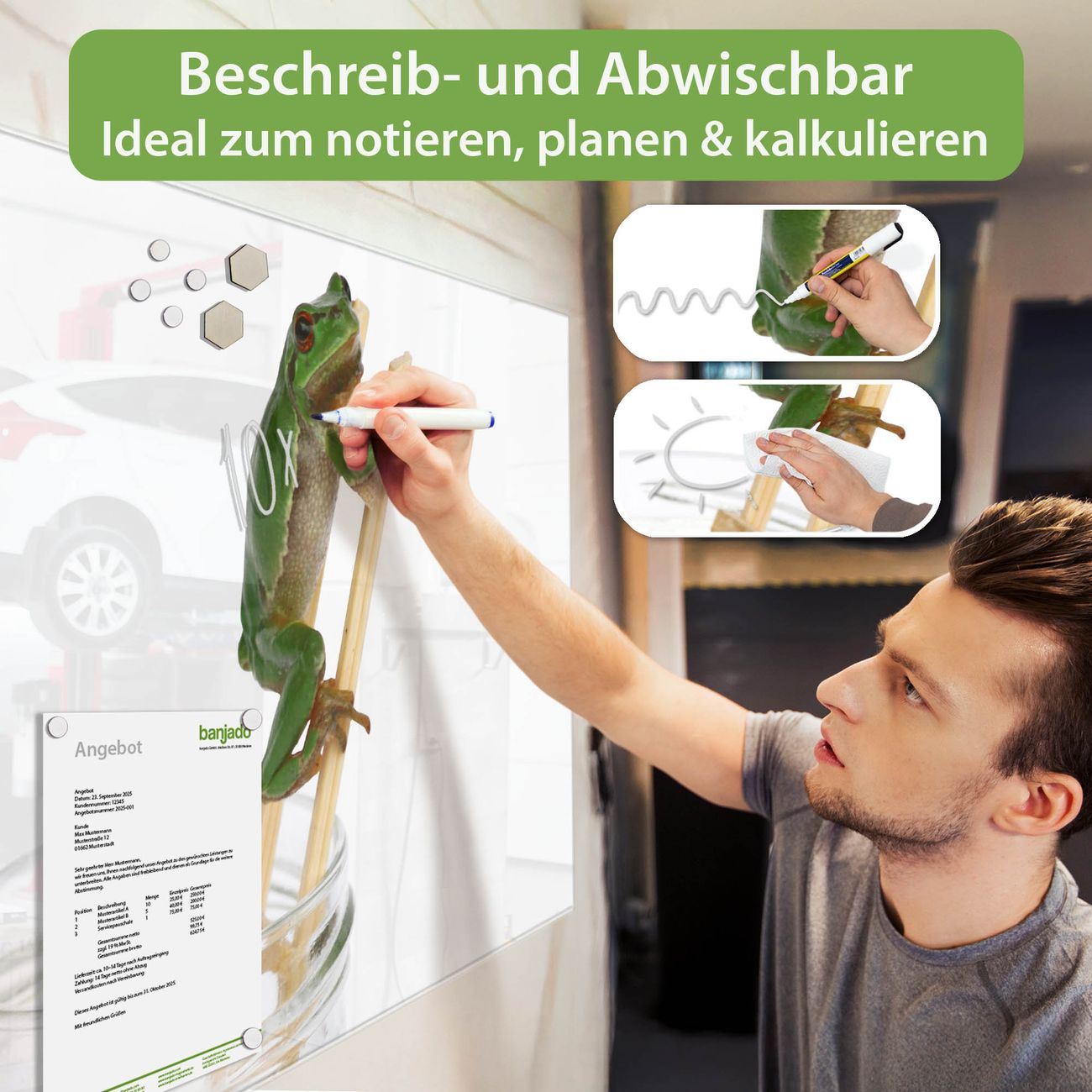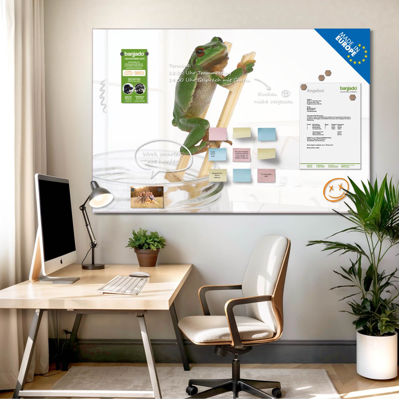 Jede Glas Magnettafel wird in unserer Werkstatt von Hand gefertigt und sorgfältig geprüft. So erhalten Sie ein echtes Qualitätsprodukt, das Funktion und Ästhetik perfekt vereint.?? Warum banjado?