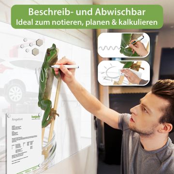 Auf der glatten Glasoberfläche lassen sich Termine, Rezepte oder Notizen ganz einfach mit Kreidestiften festhalten und rückstandslos entfernen. Starke Neodym-Magnete halten Ihre wichtigsten Erinnerungen sicher an Ort und Stelle. So entsteht Ihre ganz persönliche Ideenwand - jeden Tag neu.