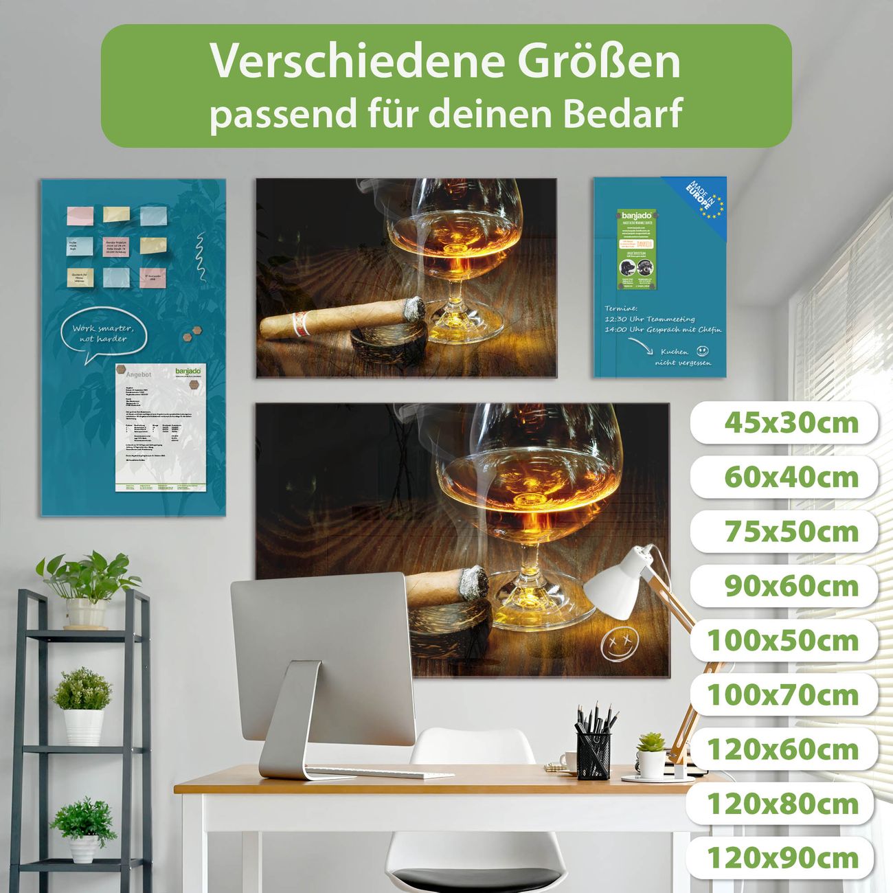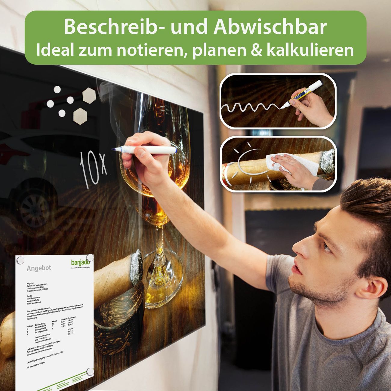 Die banjado Glas Magnettafel mit dem Motiv Motiv Whiskey & Cigar verbindet Funktionalität mit Stil. Sie ersetzt das Zettelchaos durch klare Strukturen und bringt dabei eine warme, natürliche Atmosphäre in Ihr Zuhause. Ob im Büro, in der Küche oder im Eingangsbereich - dieses Design-Board zieht Blicke an und sorgt für Ordnung mit Charakter.