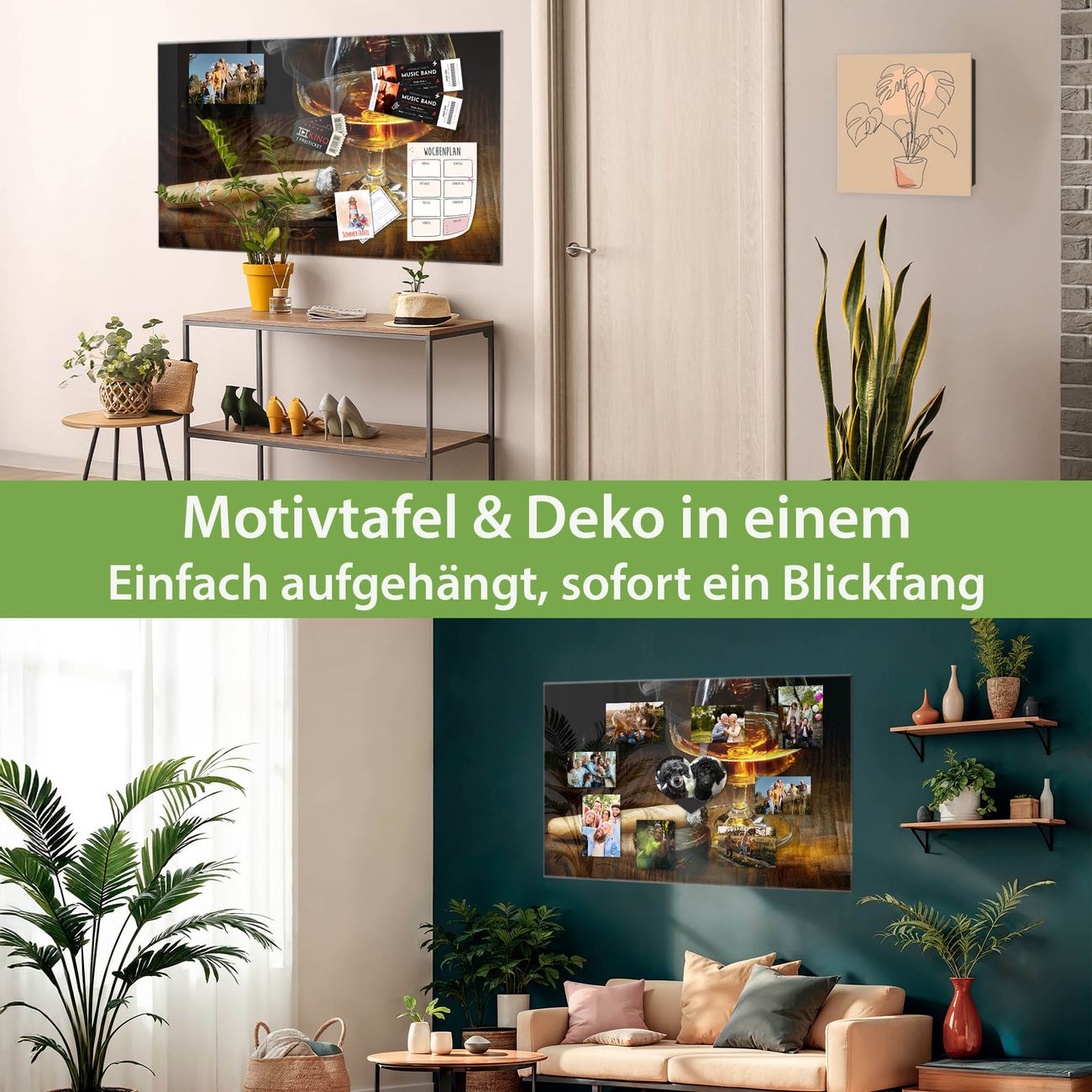 Ein Stück Design, das Ihren Alltag organisiert. Schreiben, heften, inspirieren - alles an einem Ort. Qualität, die man spürt. Montage leicht gemacht. Handwerk mit Herz - veredelt in Sachsen. Einzigartiges Design mit Motiv Motiv Whiskey & Cigar Beschreibbare Glasoberfläche, leicht zu reinigen Starke Magnetkraft durch Stahlrückwand Inklusive 4 Neodym-Magneten Flexible Montageoptionen Handveredelt in Sachsen - Qualität, die bleibt