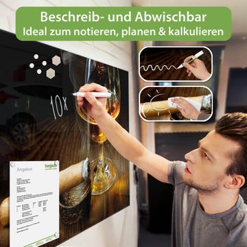 Auf der glatten Glasoberfläche lassen sich Termine, Rezepte oder Notizen ganz einfach mit Kreidestiften festhalten und rückstandslos entfernen. Starke Neodym-Magnete halten Ihre wichtigsten Erinnerungen sicher an Ort und Stelle. So entsteht Ihre ganz persönliche Ideenwand - jeden Tag neu.