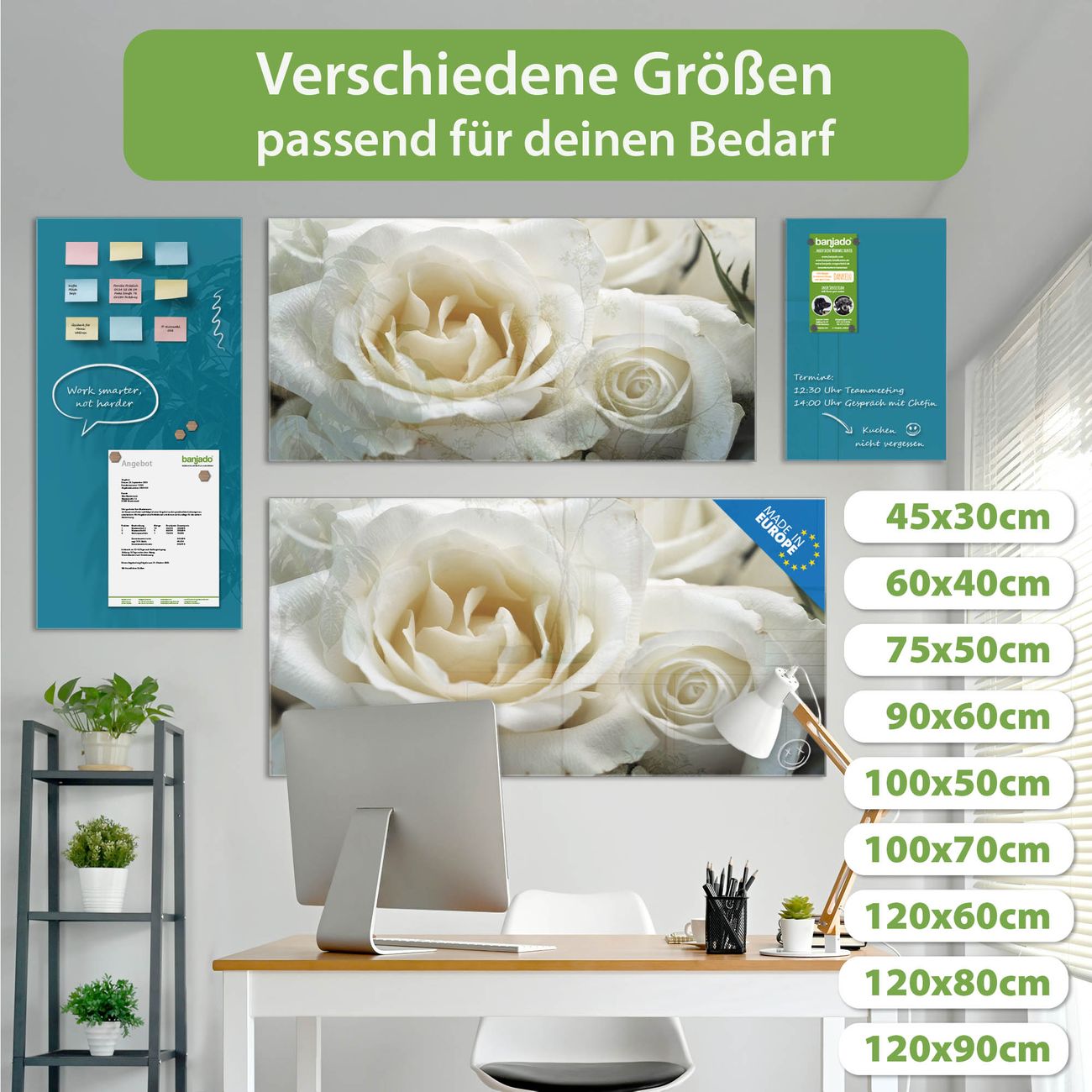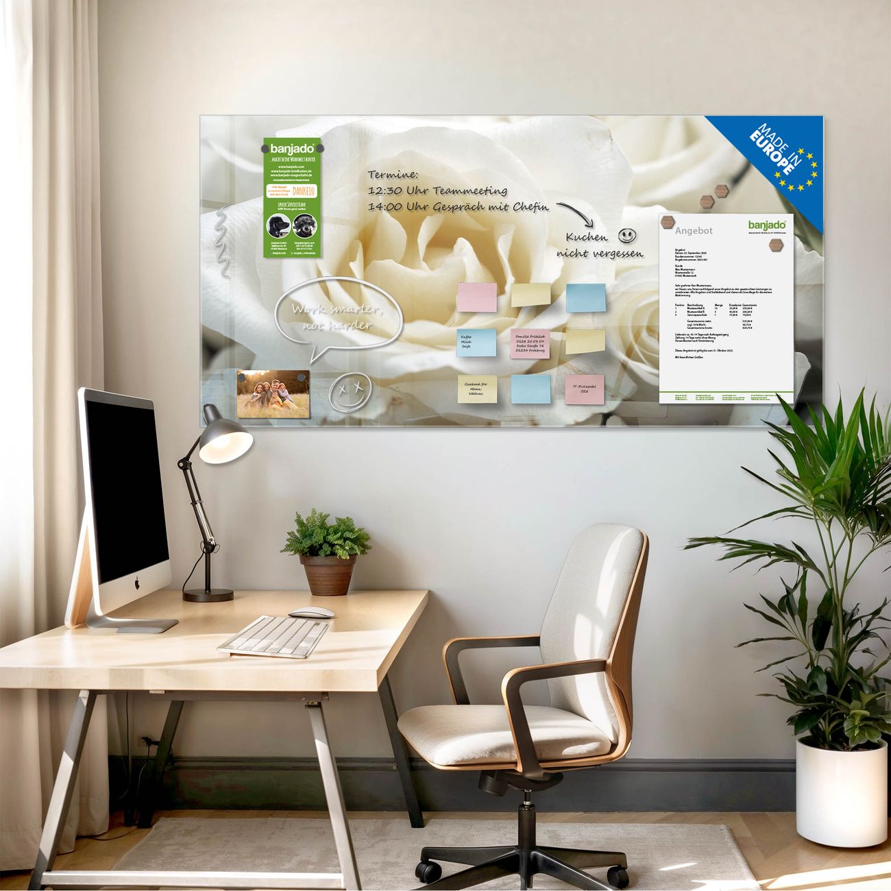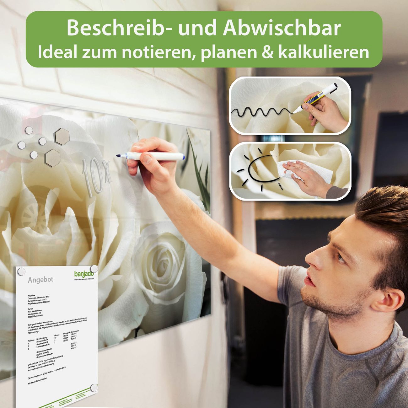 Die banjado Glas Magnettafel mit dem Motiv Motiv White Roses verbindet Funktionalität mit Stil. Sie ersetzt das Zettelchaos durch klare Strukturen und bringt dabei eine warme, natürliche Atmosphäre in Ihr Zuhause. Ob im Büro, in der Küche oder im Eingangsbereich - dieses Design-Board zieht Blicke an und sorgt für Ordnung mit Charakter.