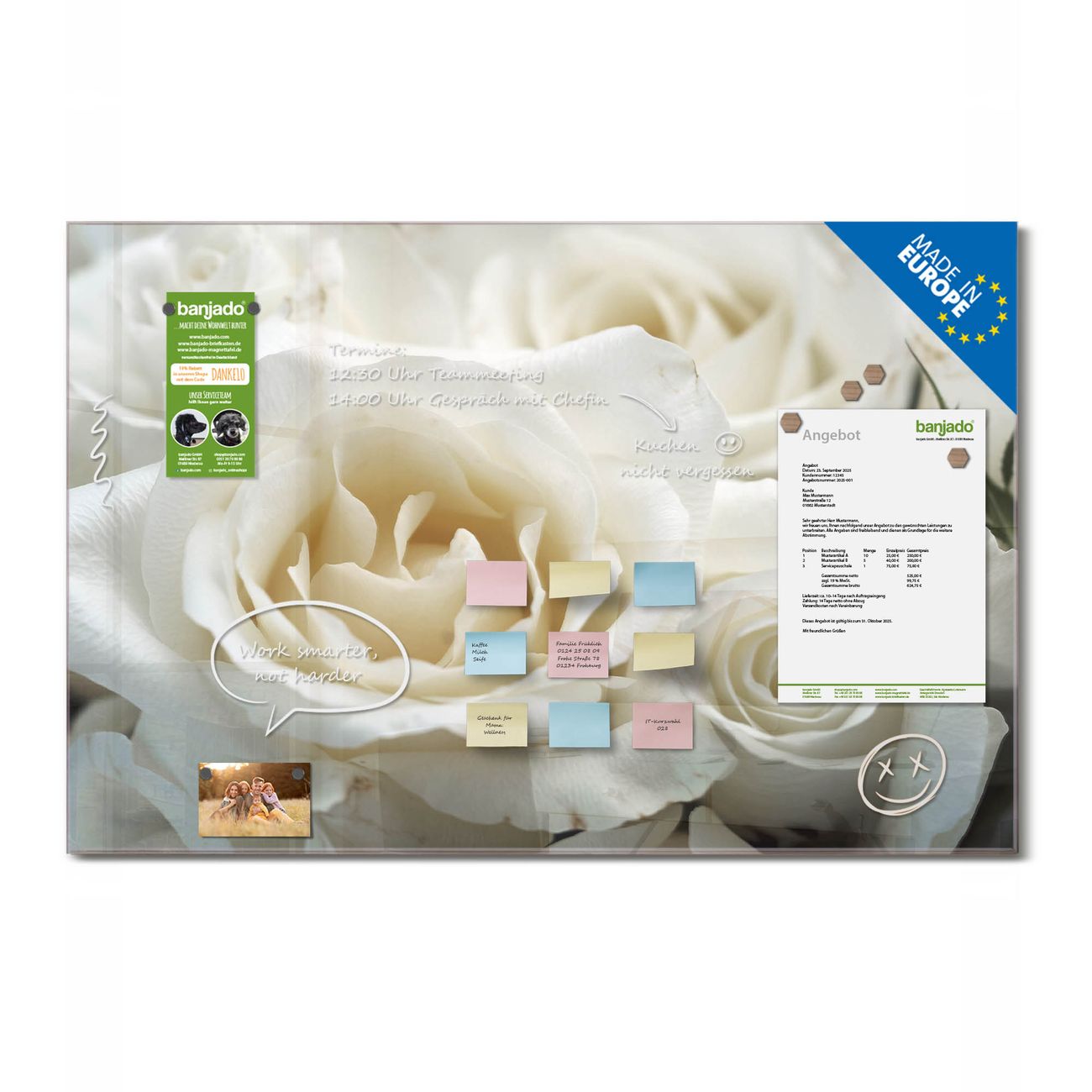 Ein Stück Design, das Ihren Alltag organisiert. Schreiben, heften, inspirieren - alles an einem Ort. Qualität, die man spürt. Montage leicht gemacht. Handwerk mit Herz - veredelt in Sachsen. Einzigartiges Design mit Motiv Motiv White Roses Beschreibbare Glasoberfläche, leicht zu reinigen Starke Magnetkraft durch Stahlrückwand Inklusive 4 Neodym-Magneten Flexible Montageoptionen Handveredelt in Sachsen - Qualität, die bleibt