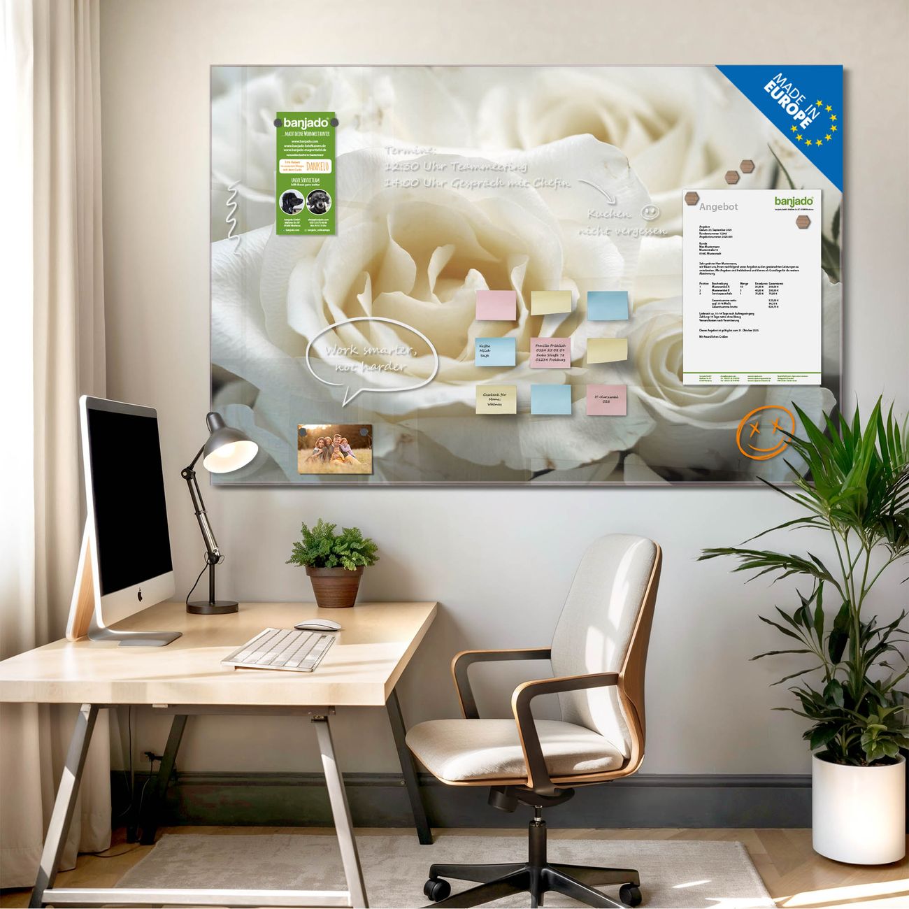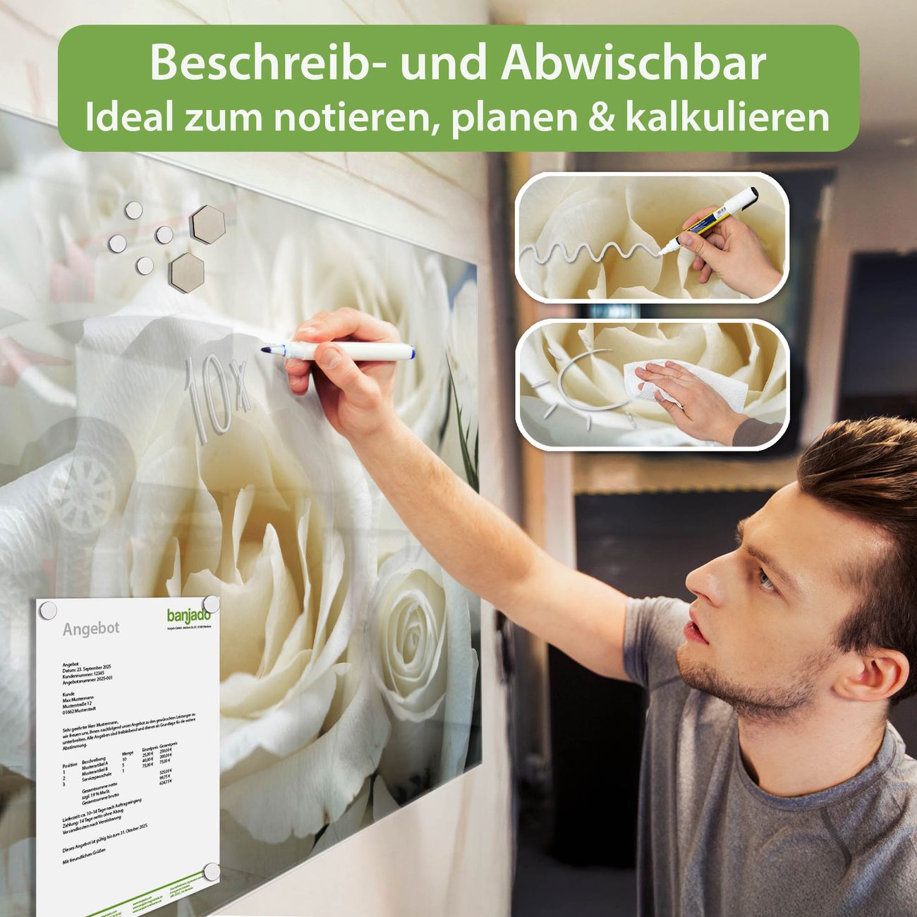 Jede Glas Magnettafel wird in unserer Werkstatt von Hand gefertigt und sorgfältig geprüft. So erhalten Sie ein echtes Qualitätsprodukt, das Funktion und Ästhetik perfekt vereint.?? Warum banjado?