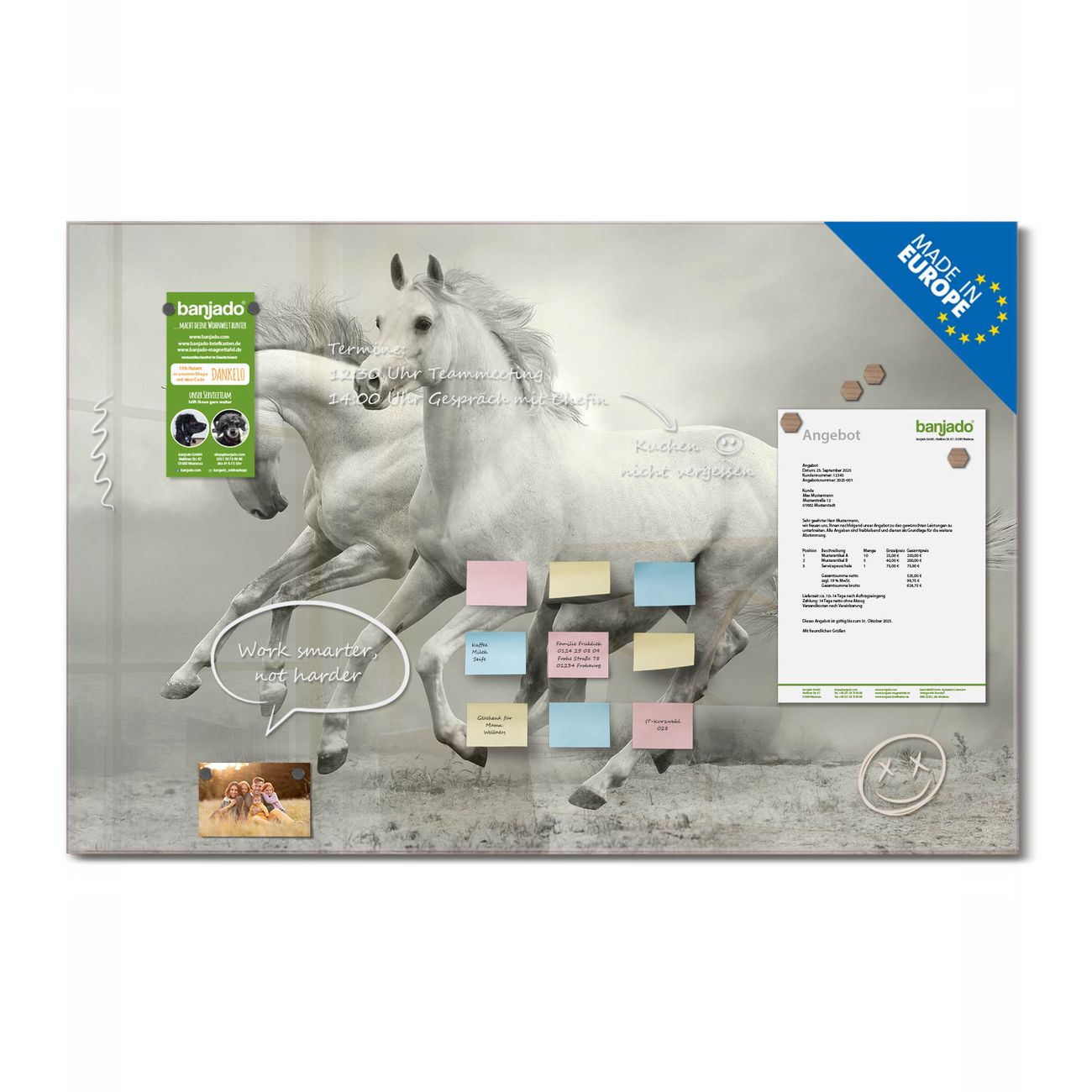 Jede Glas Magnettafel wird in unserer Werkstatt von Hand gefertigt und sorgfältig geprüft. So erhalten Sie ein echtes Qualitätsprodukt, das Funktion und Ästhetik perfekt vereint.?? Warum banjado?