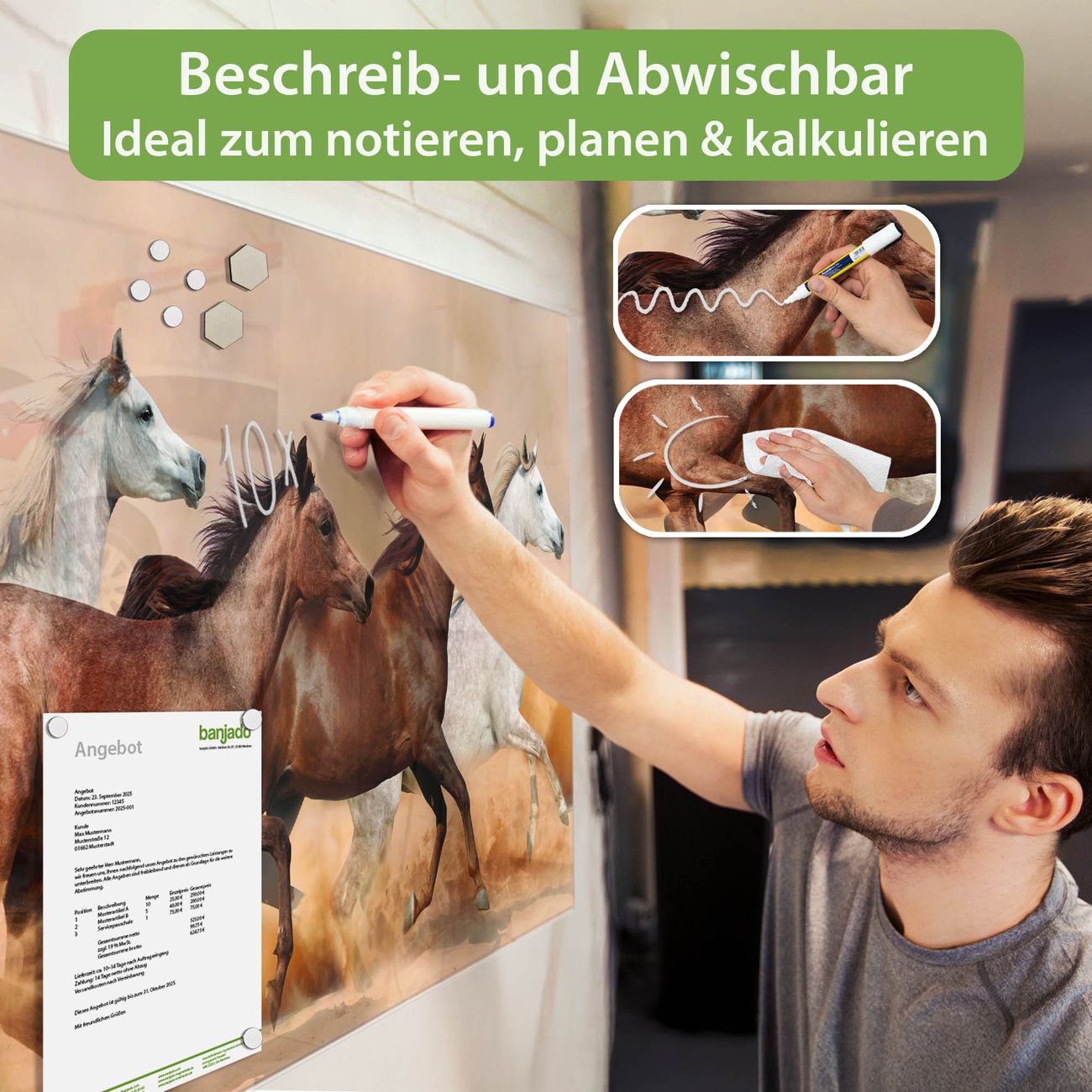 Die banjado Glas Magnettafel mit dem Motiv Motiv Wilde Pferde verbindet Funktionalität mit Stil. Sie ersetzt das Zettelchaos durch klare Strukturen und bringt dabei eine warme, natürliche Atmosphäre in Ihr Zuhause. Ob im Büro, in der Küche oder im Eingangsbereich - dieses Design-Board zieht Blicke an und sorgt für Ordnung mit Charakter.