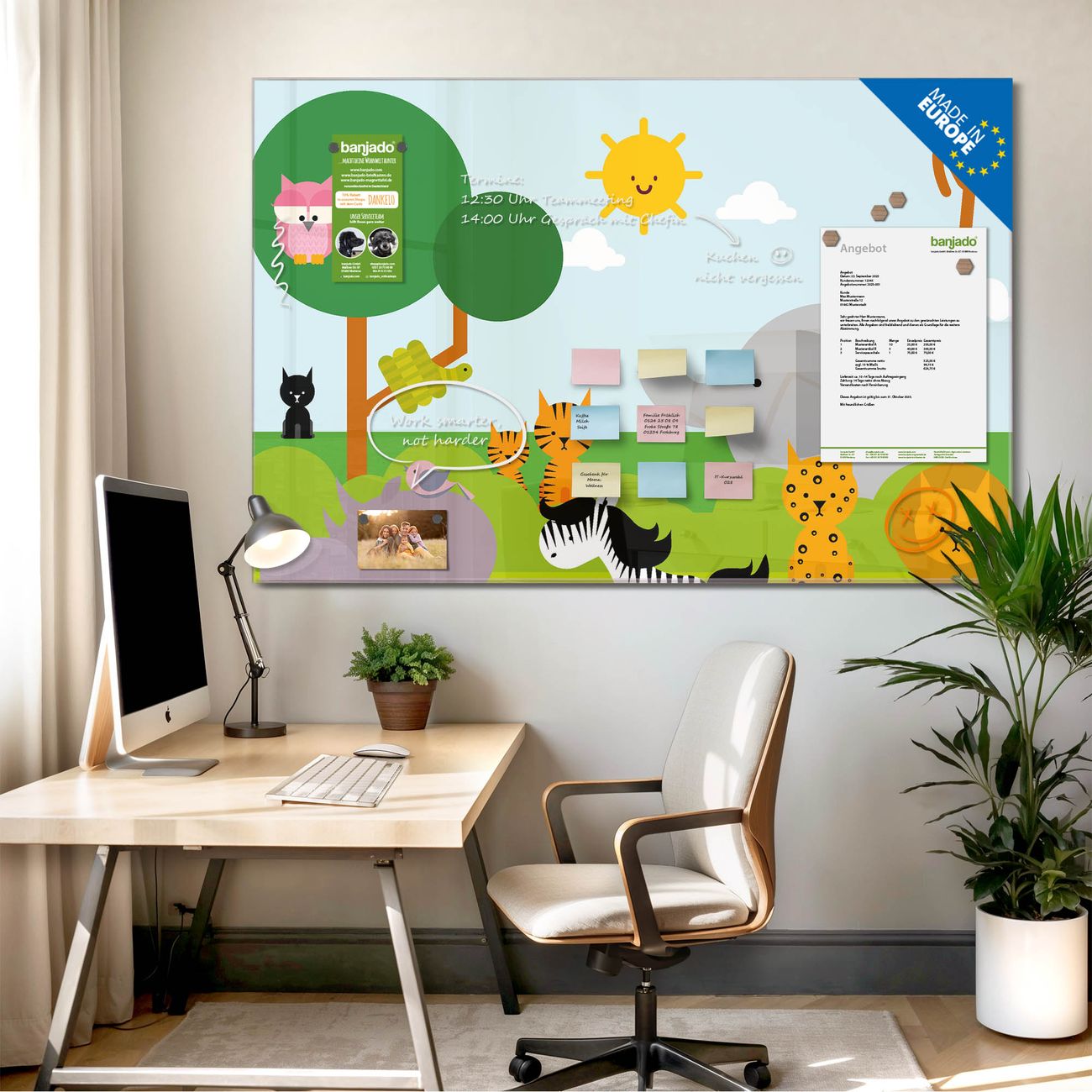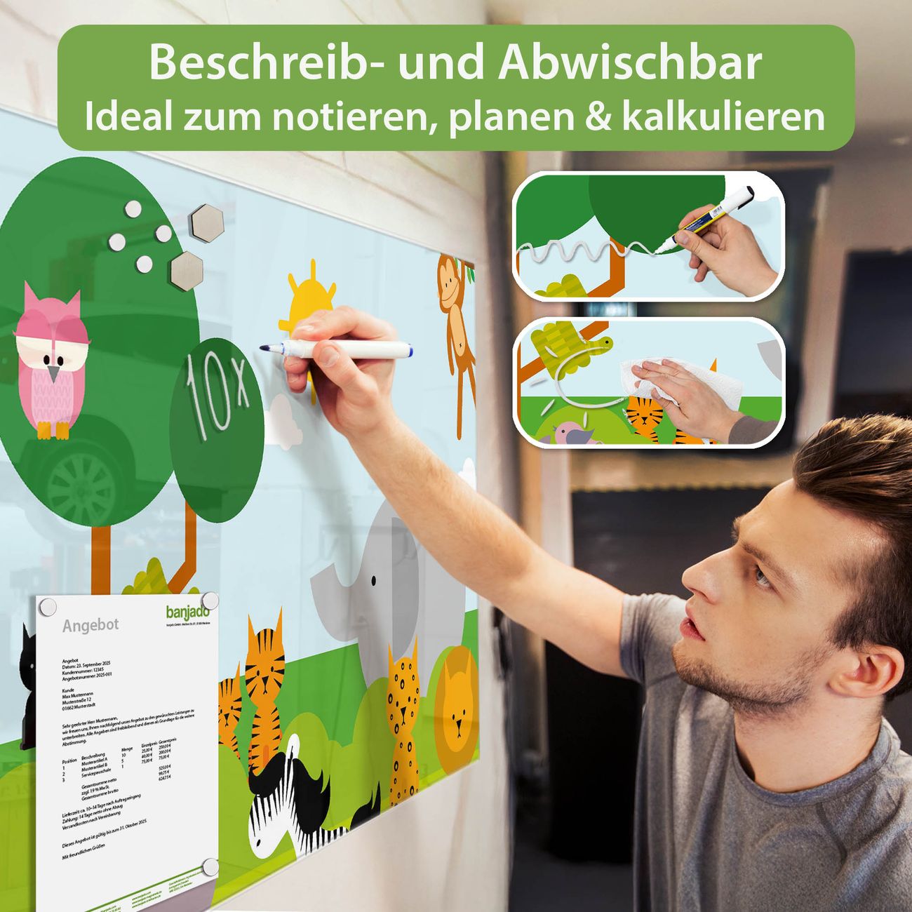 Jede Glas Magnettafel wird in unserer Werkstatt von Hand gefertigt und sorgfältig geprüft. So erhalten Sie ein echtes Qualitätsprodukt, das Funktion und Ästhetik perfekt vereint.?? Warum banjado?