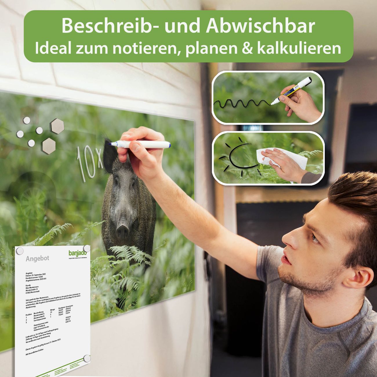 Die banjado Glas Magnettafel mit dem Motiv Motiv Wildschwein verbindet Funktionalität mit Stil. Sie ersetzt das Zettelchaos durch klare Strukturen und bringt dabei eine warme, natürliche Atmosphäre in Ihr Zuhause. Ob im Büro, in der Küche oder im Eingangsbereich - dieses Design-Board zieht Blicke an und sorgt für Ordnung mit Charakter.