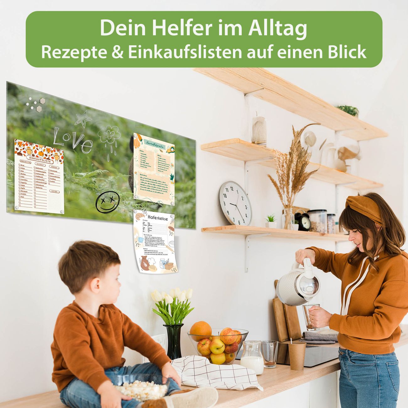 Auf der glatten Glasoberfläche lassen sich Termine, Rezepte oder Notizen ganz einfach mit Kreidestiften festhalten und rückstandslos entfernen. Starke Neodym-Magnete halten Ihre wichtigsten Erinnerungen sicher an Ort und Stelle. So entsteht Ihre ganz persönliche Ideenwand - jeden Tag neu.