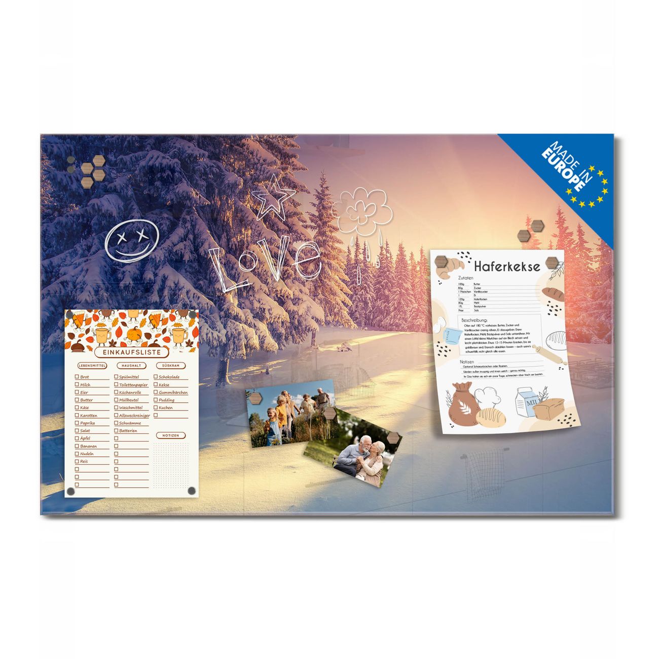 Ein Stück Design, das Ihren Alltag organisiert. Schreiben, heften, inspirieren - alles an einem Ort. Qualität, die man spürt. Montage leicht gemacht. Handwerk mit Herz - veredelt in Sachsen. Einzigartiges Design mit Motiv Motiv Winterabend Beschreibbare Glasoberfläche, leicht zu reinigen Starke Magnetkraft durch Stahlrückwand Inklusive 4 Neodym-Magneten Flexible Montageoptionen Handveredelt in Sachsen - Qualität, die bleibt