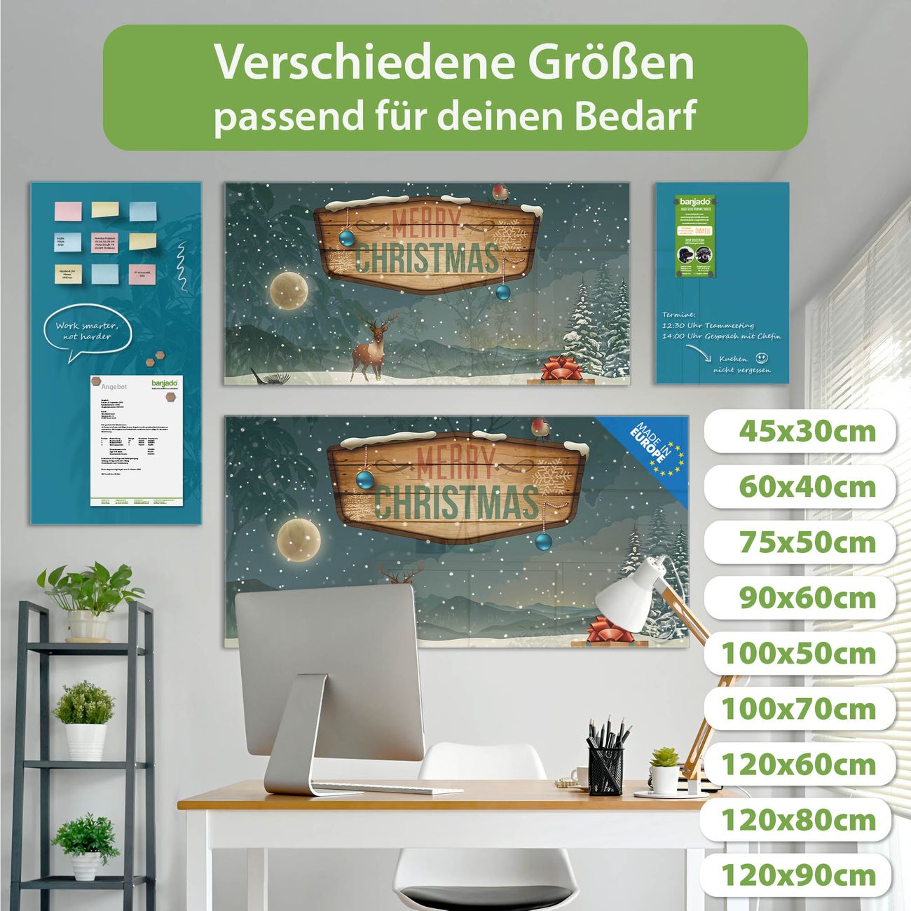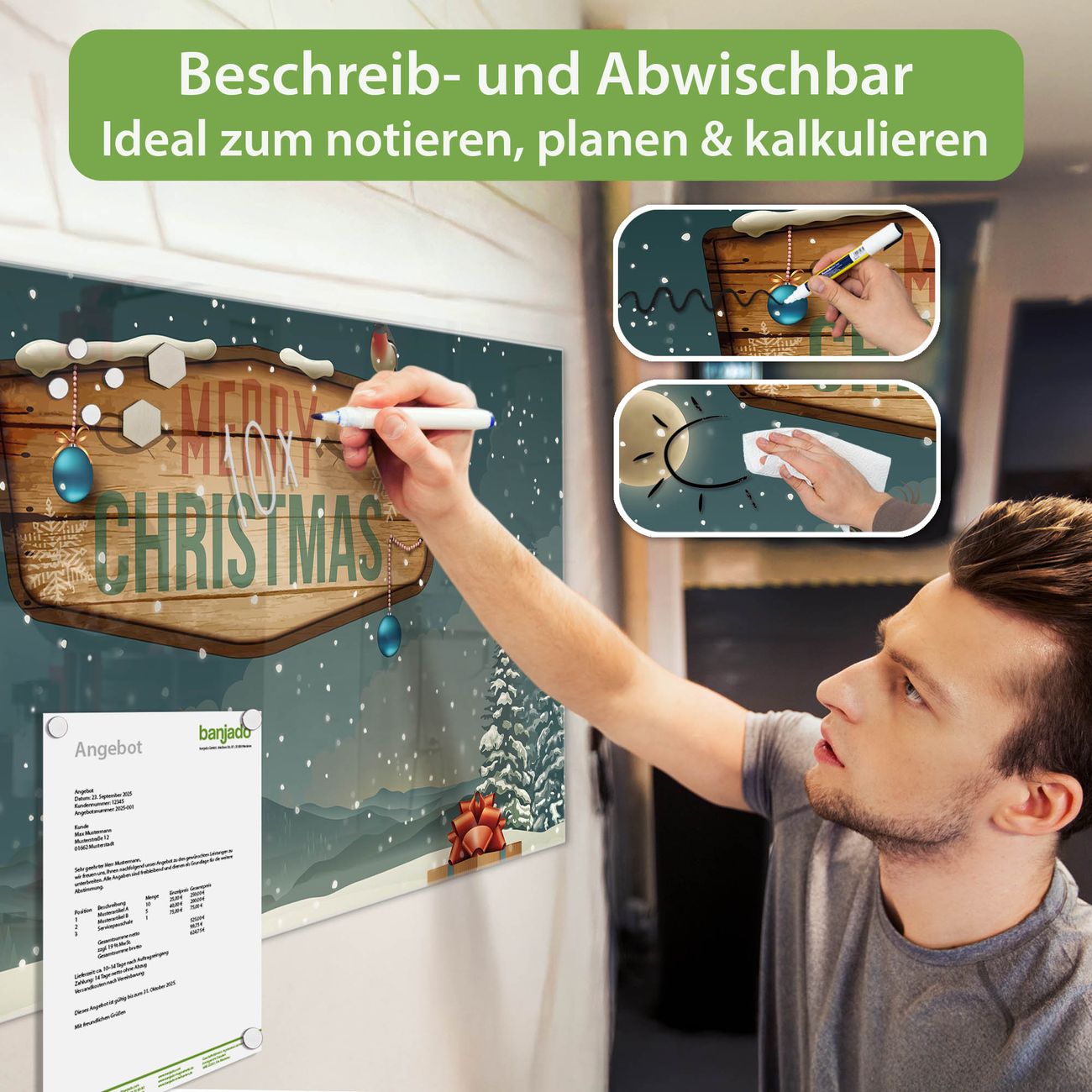 Jede Glas Magnettafel wird in unserer Werkstatt von Hand gefertigt und sorgfältig geprüft. So erhalten Sie ein echtes Qualitätsprodukt, das Funktion und Ästhetik perfekt vereint.?? Warum banjado?
