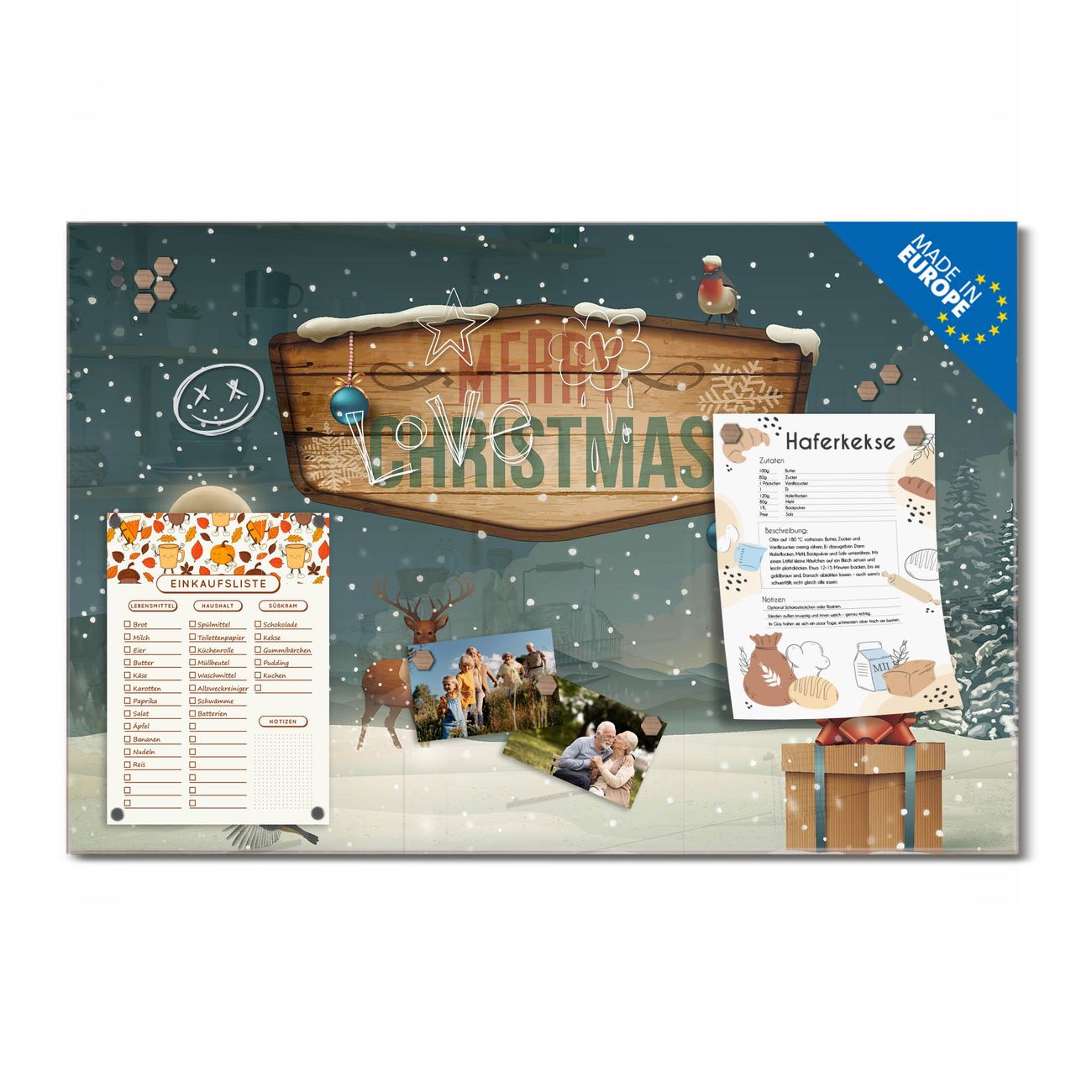 Ein Stück Design, das Ihren Alltag organisiert. Schreiben, heften, inspirieren - alles an einem Ort. Qualität, die man spürt. Montage leicht gemacht. Handwerk mit Herz - veredelt in Sachsen. Einzigartiges Design mit Motiv Motiv Weihnachtsland Beschreibbare Glasoberfläche, leicht zu reinigen Starke Magnetkraft durch Stahlrückwand Inklusive 4 Neodym-Magneten Flexible Montageoptionen Handveredelt in Sachsen - Qualität, die bleibt