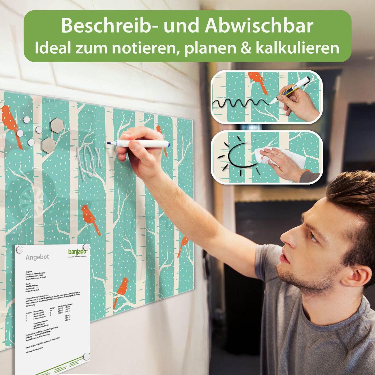 Jede Glas Magnettafel wird in unserer Werkstatt von Hand gefertigt und sorgfältig geprüft. So erhalten Sie ein echtes Qualitätsprodukt, das Funktion und Ästhetik perfekt vereint.?? Warum banjado?