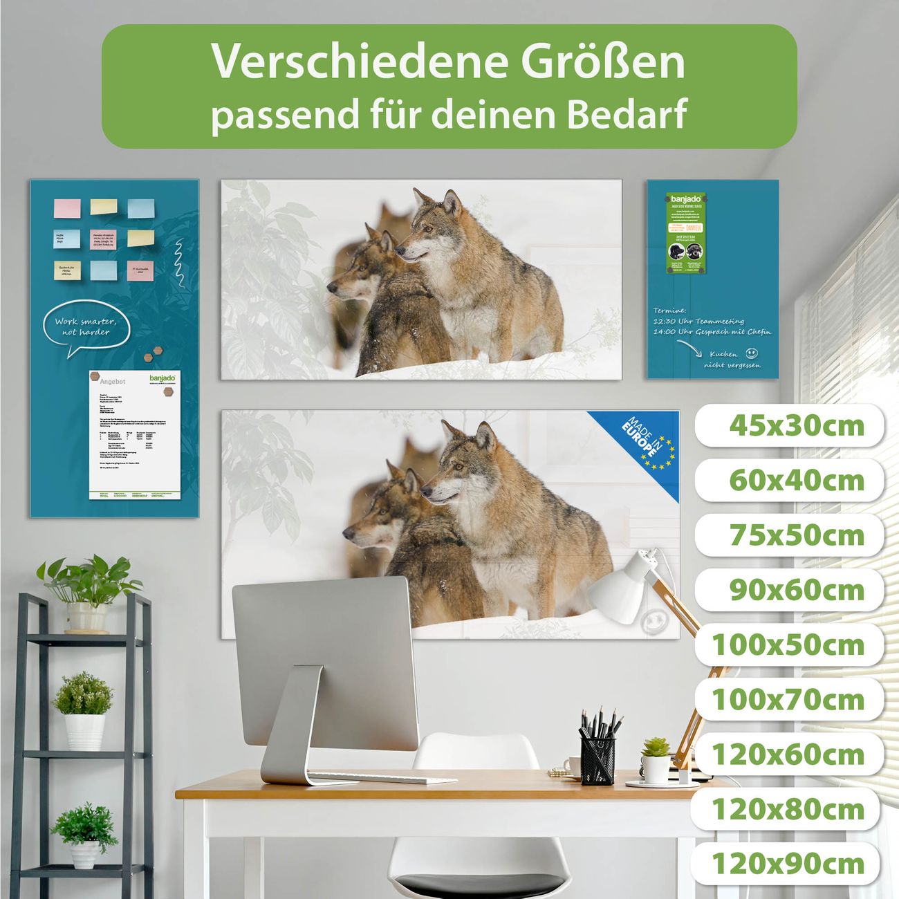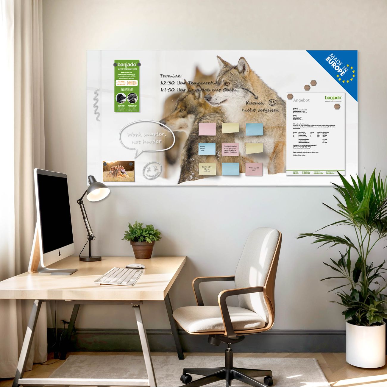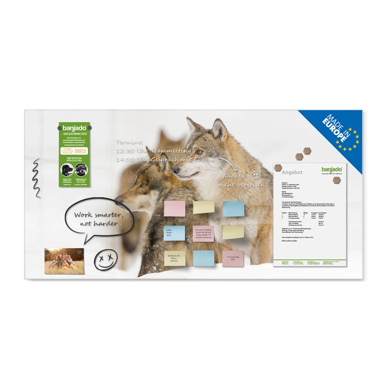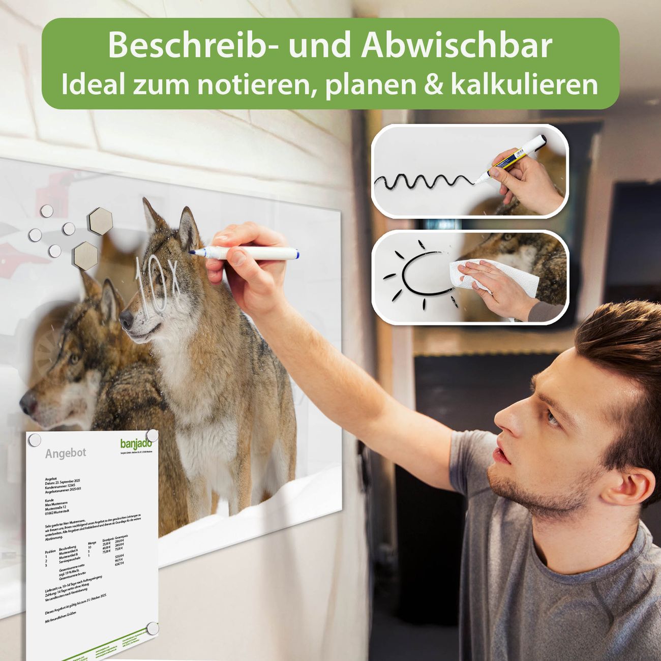 Die banjado Glas Magnettafel mit dem Motiv Motiv Wölfe verbindet Funktionalität mit Stil. Sie ersetzt das Zettelchaos durch klare Strukturen und bringt dabei eine warme, natürliche Atmosphäre in Ihr Zuhause. Ob im Büro, in der Küche oder im Eingangsbereich - dieses Design-Board zieht Blicke an und sorgt für Ordnung mit Charakter.