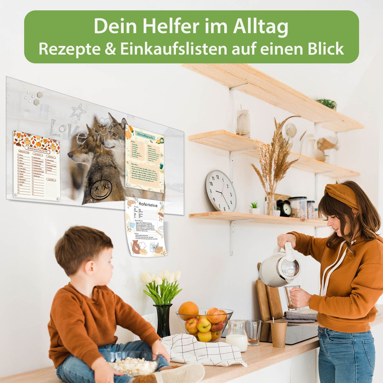 Ein Stück Design, das Ihren Alltag organisiert. Schreiben, heften, inspirieren - alles an einem Ort. Qualität, die man spürt. Montage leicht gemacht. Handwerk mit Herz - veredelt in Sachsen. Einzigartiges Design mit Motiv Motiv Wölfe Beschreibbare Glasoberfläche, leicht zu reinigen Starke Magnetkraft durch Stahlrückwand Inklusive 4 Neodym-Magneten Flexible Montageoptionen Handveredelt in Sachsen - Qualität, die bleibt