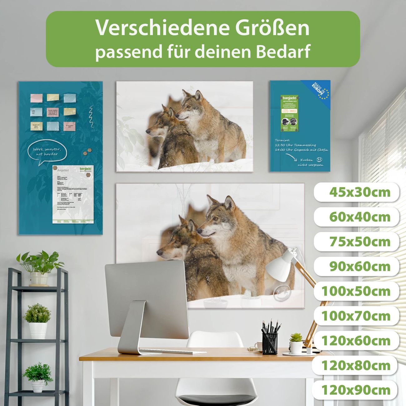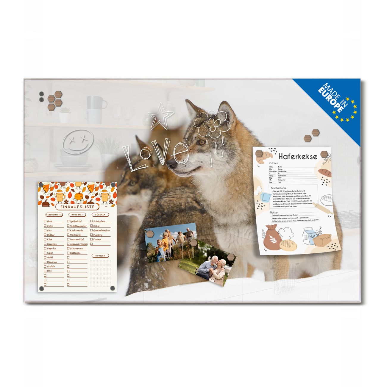Ein Stück Design, das Ihren Alltag organisiert. Schreiben, heften, inspirieren - alles an einem Ort. Qualität, die man spürt. Montage leicht gemacht. Handwerk mit Herz - veredelt in Sachsen. Einzigartiges Design mit Motiv Motiv Wölfe Beschreibbare Glasoberfläche, leicht zu reinigen Starke Magnetkraft durch Stahlrückwand Inklusive 4 Neodym-Magneten Flexible Montageoptionen Handveredelt in Sachsen - Qualität, die bleibt