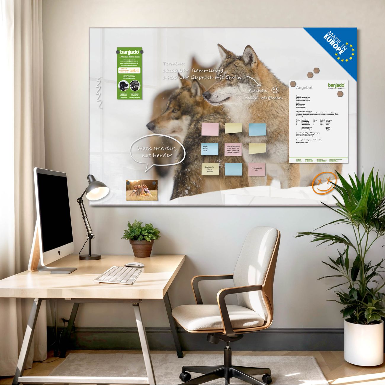 Die banjado Glas Magnettafel mit dem Motiv Motiv Wölfe verbindet Funktionalität mit Stil. Sie ersetzt das Zettelchaos durch klare Strukturen und bringt dabei eine warme, natürliche Atmosphäre in Ihr Zuhause. Ob im Büro, in der Küche oder im Eingangsbereich - dieses Design-Board zieht Blicke an und sorgt für Ordnung mit Charakter.