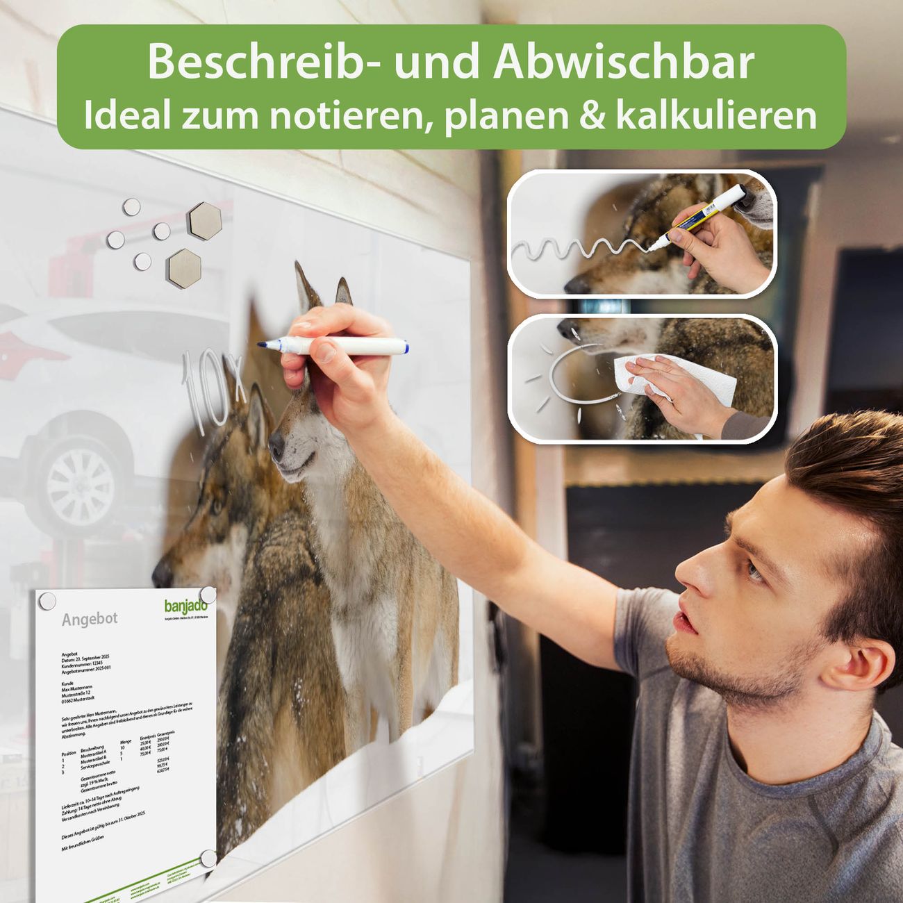 Jede Glas Magnettafel wird in unserer Werkstatt von Hand gefertigt und sorgfältig geprüft. So erhalten Sie ein echtes Qualitätsprodukt, das Funktion und Ästhetik perfekt vereint.?? Warum banjado?