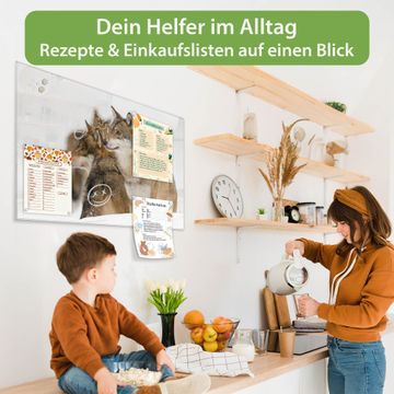 Auf der glatten Glasoberfläche lassen sich Termine, Rezepte oder Notizen ganz einfach mit Kreidestiften festhalten und rückstandslos entfernen. Starke Neodym-Magnete halten Ihre wichtigsten Erinnerungen sicher an Ort und Stelle. So entsteht Ihre ganz persönliche Ideenwand - jeden Tag neu.