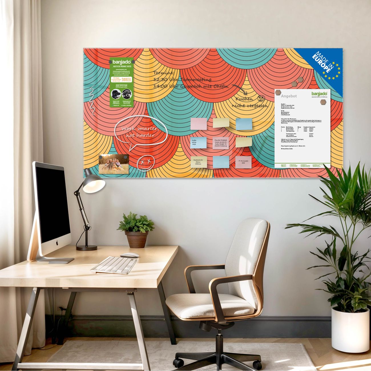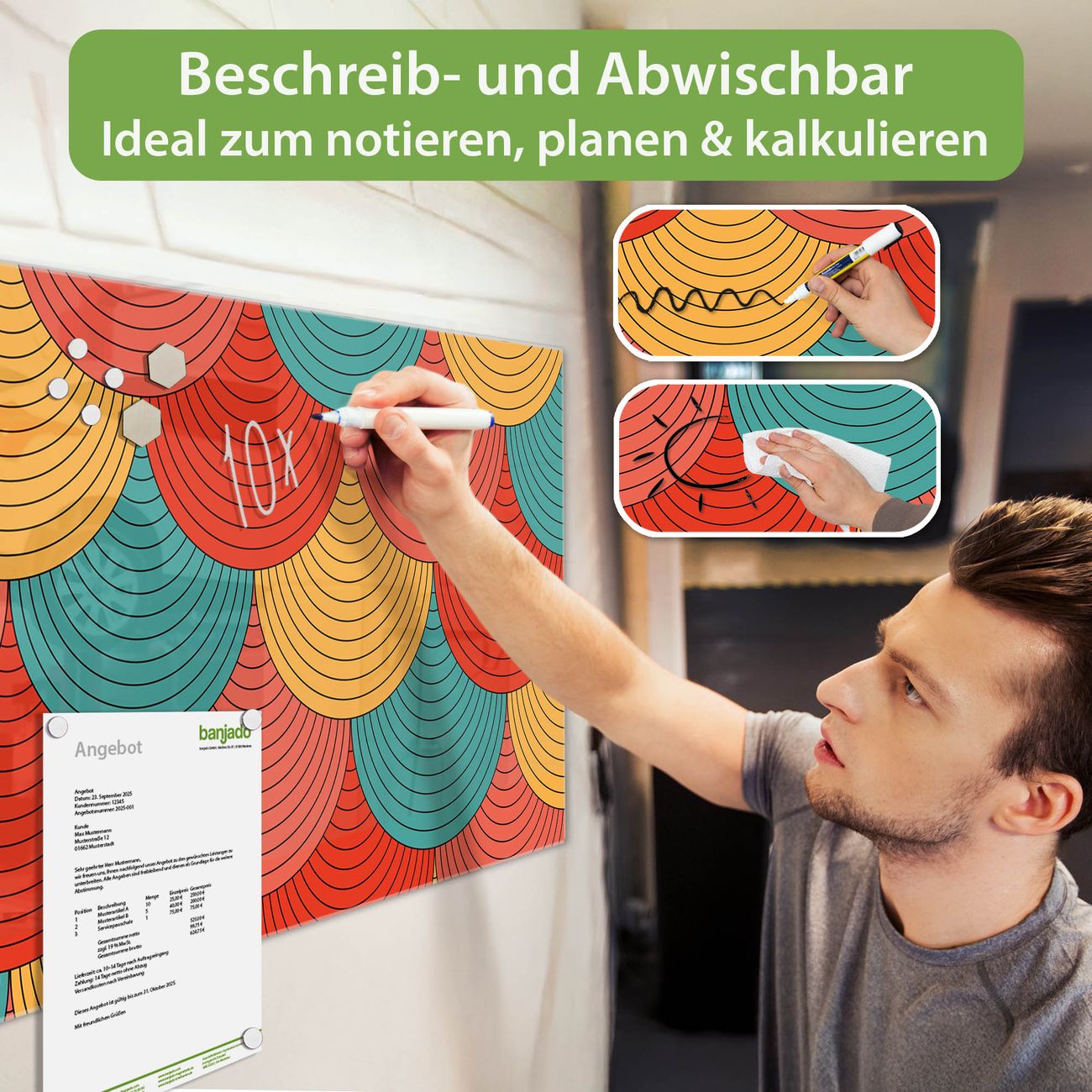 Jede Glas Magnettafel wird in unserer Werkstatt von Hand gefertigt und sorgfältig geprüft. So erhalten Sie ein echtes Qualitätsprodukt, das Funktion und Ästhetik perfekt vereint.?? Warum banjado?