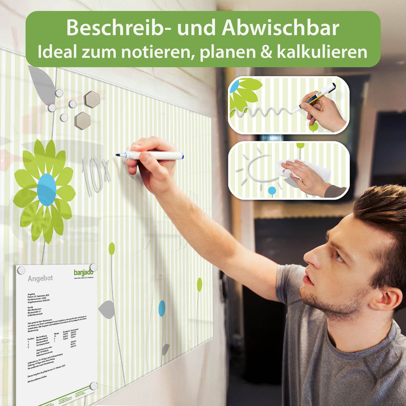 Die banjado Glas Magnettafel mit dem Motiv Motiv Zarte Blumen verbindet Funktionalität mit Stil. Sie ersetzt das Zettelchaos durch klare Strukturen und bringt dabei eine warme, natürliche Atmosphäre in Ihr Zuhause. Ob im Büro, in der Küche oder im Eingangsbereich - dieses Design-Board zieht Blicke an und sorgt für Ordnung mit Charakter.
