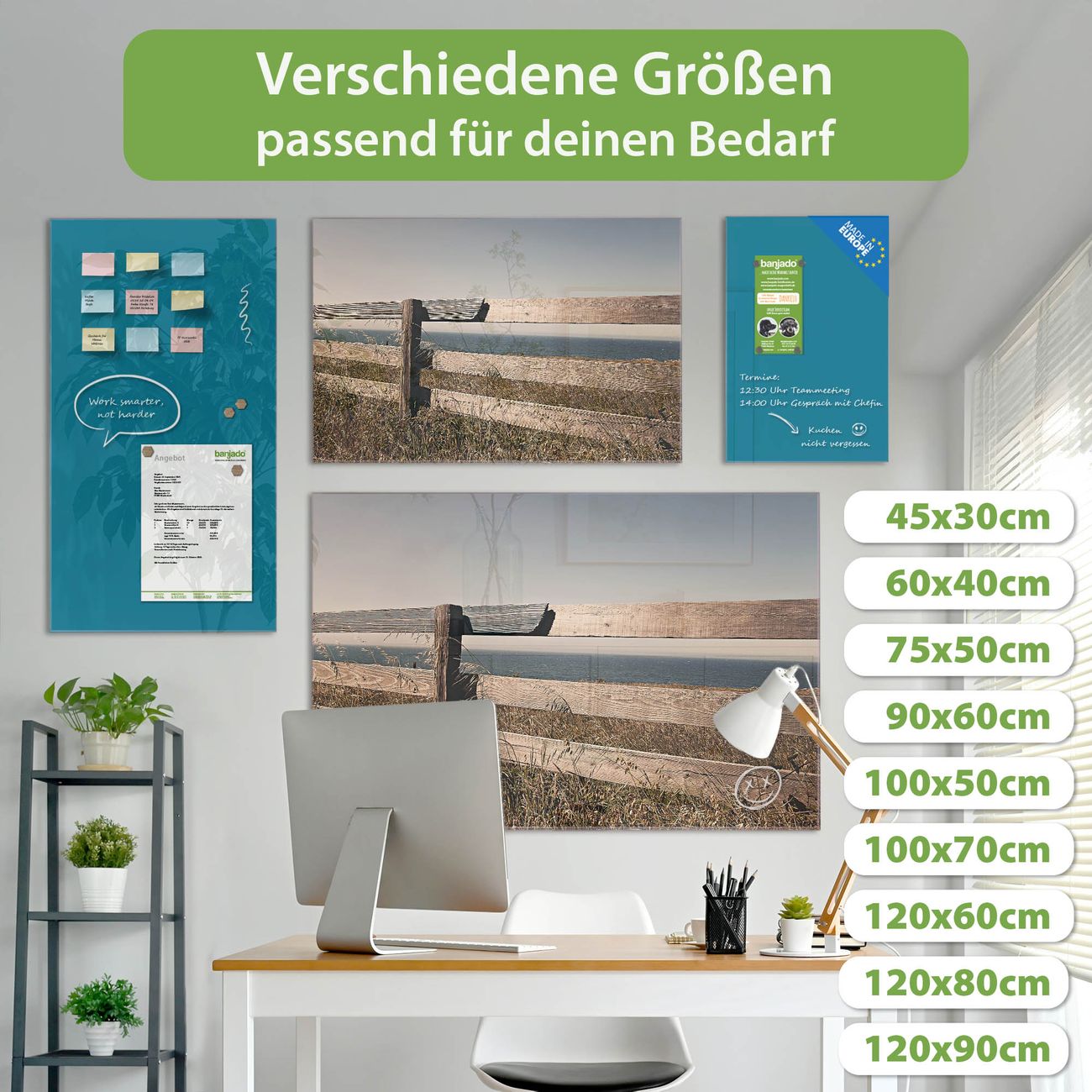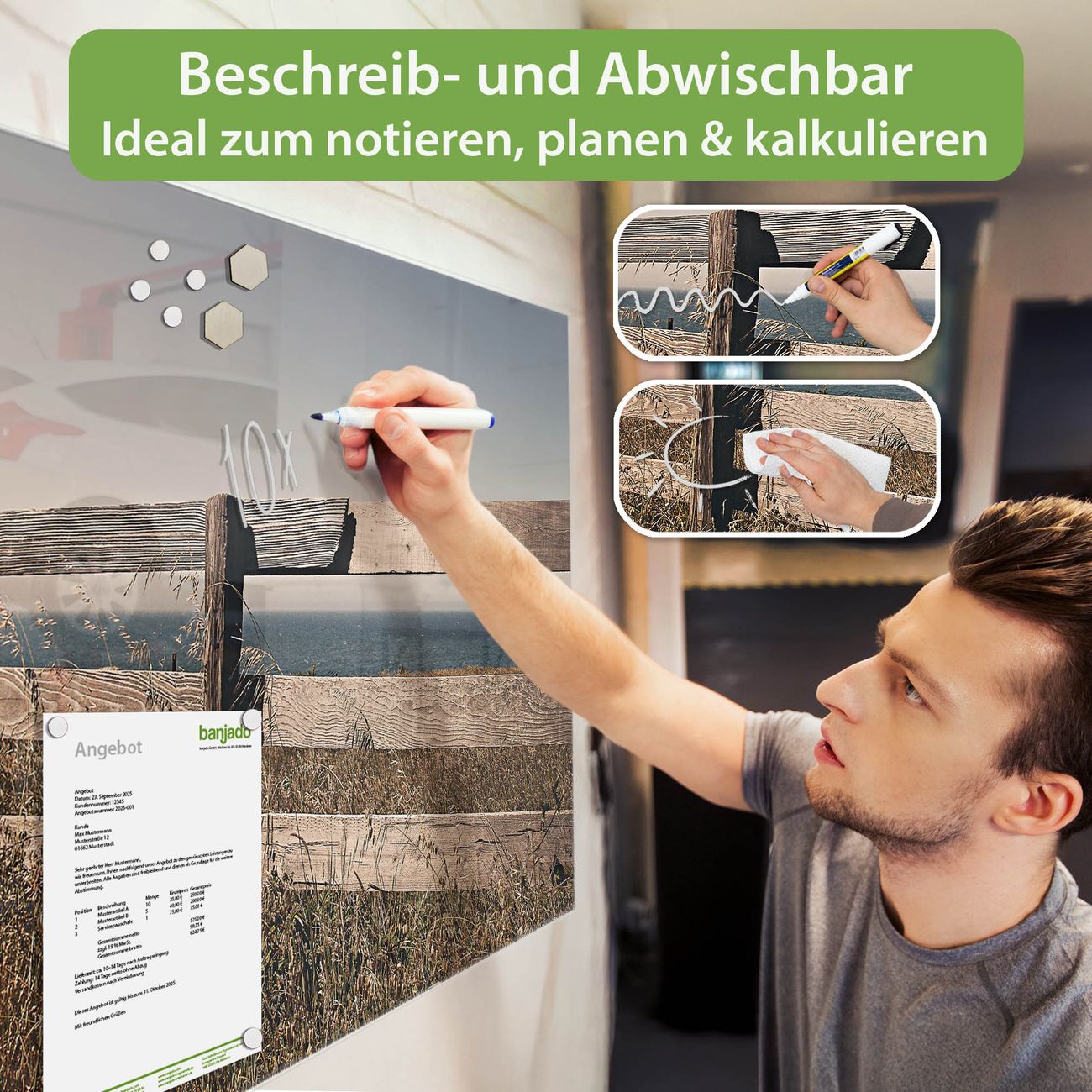 Jede Glas Magnettafel wird in unserer Werkstatt von Hand gefertigt und sorgfältig geprüft. So erhalten Sie ein echtes Qualitätsprodukt, das Funktion und Ästhetik perfekt vereint.?? Warum banjado?